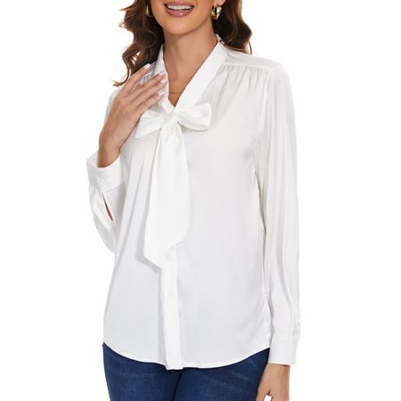 Women‘s Long Sleeve Bow Tie Neck Satin Solid Blouse in White