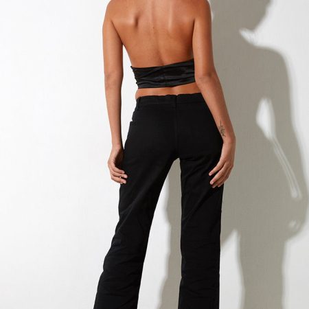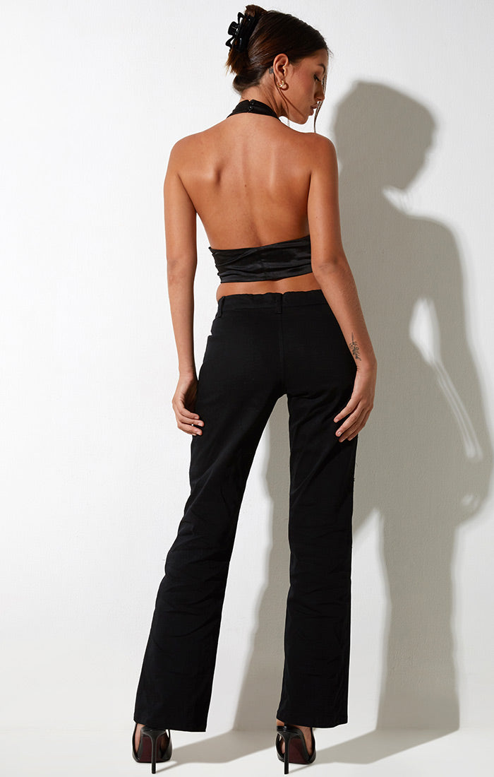 Balita Top is our new satin crop top featuring a thick band that goes around your waist, as well as a cross over halter neck tie. This sexy satin black crop features an open back design. Balita top is from Motel Rocks.