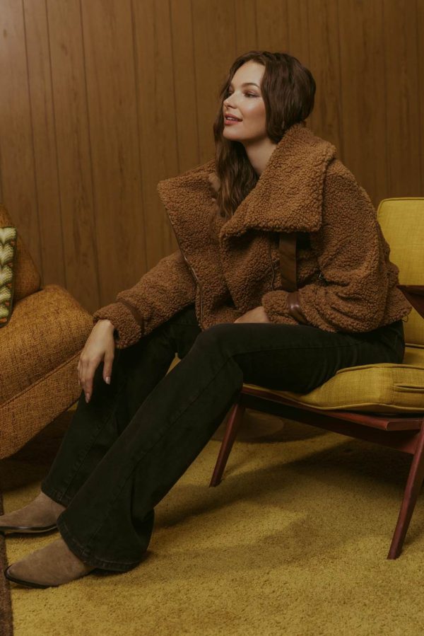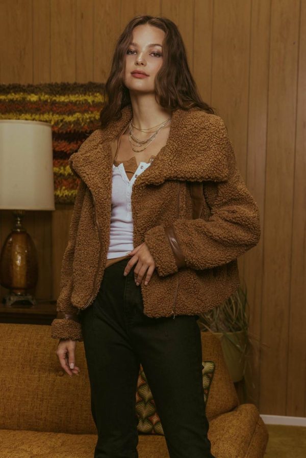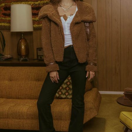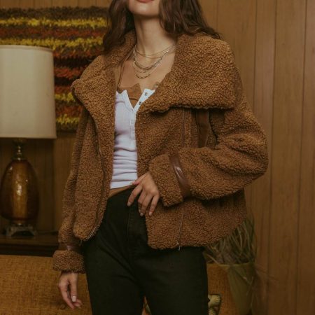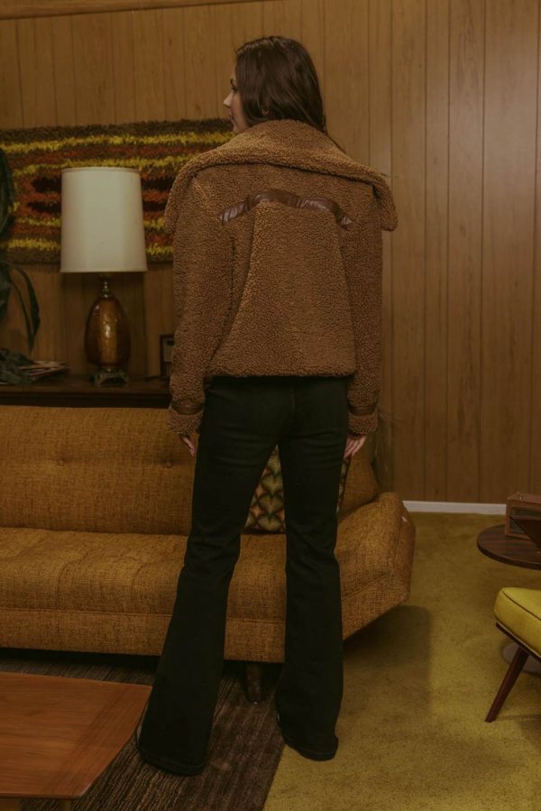 Stay warm and stylish this season with this white CallahanSherpa Jacket. Crafted from high-qualitybrown sherpa with dark brown detailing, this slightly cropped jacket contains a zipper closure to keep you snug and warm. Look and feel your best in this fall and winter season.