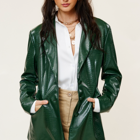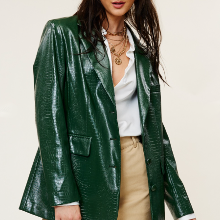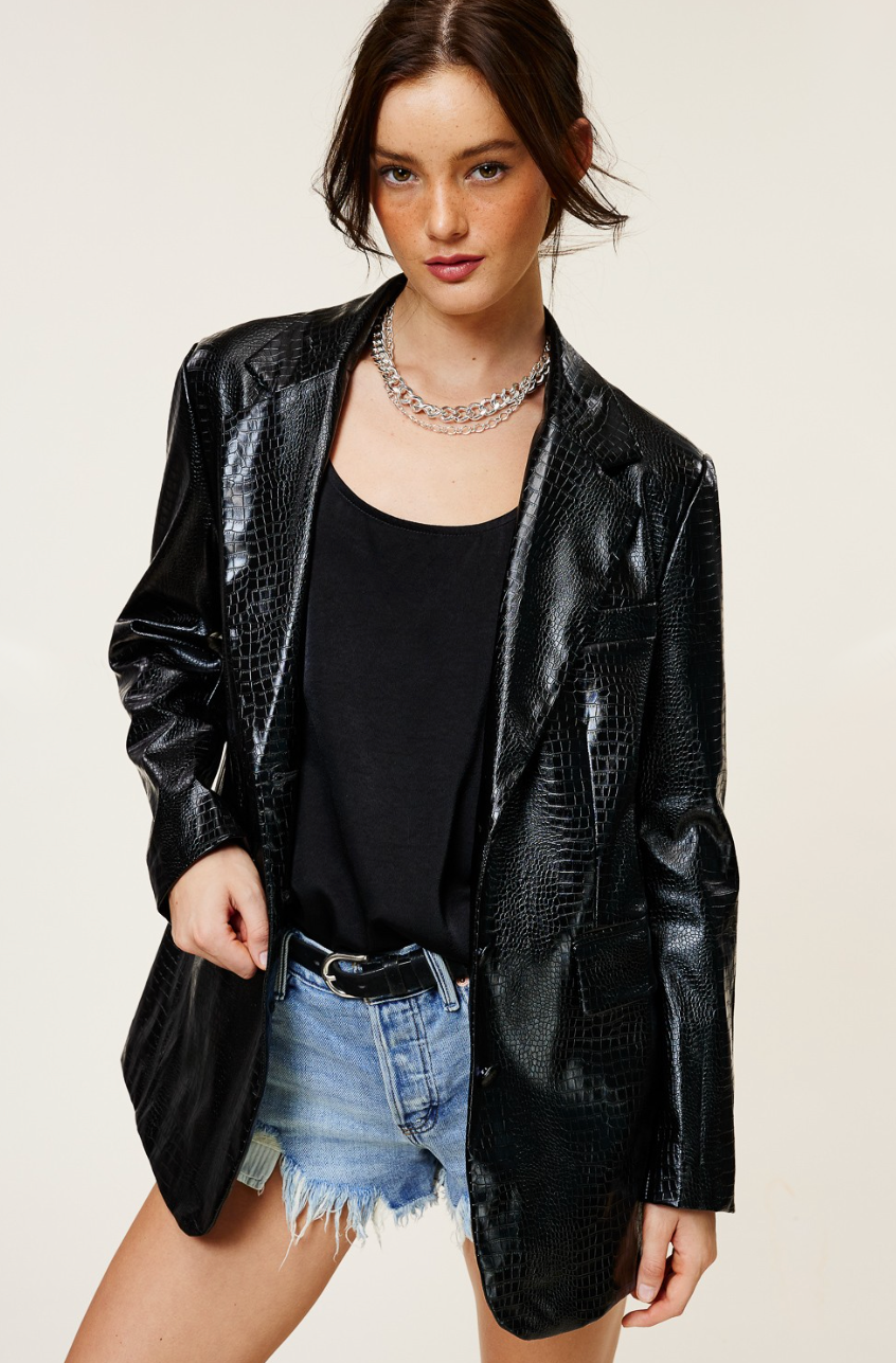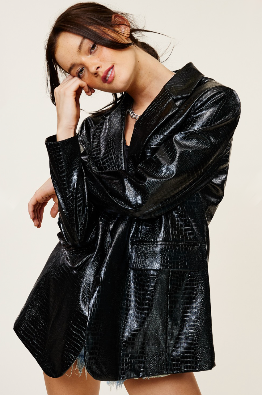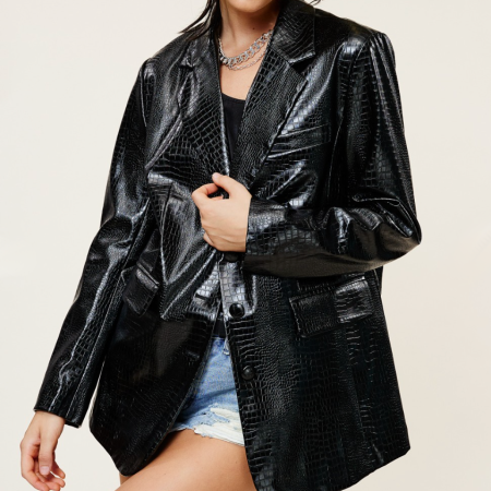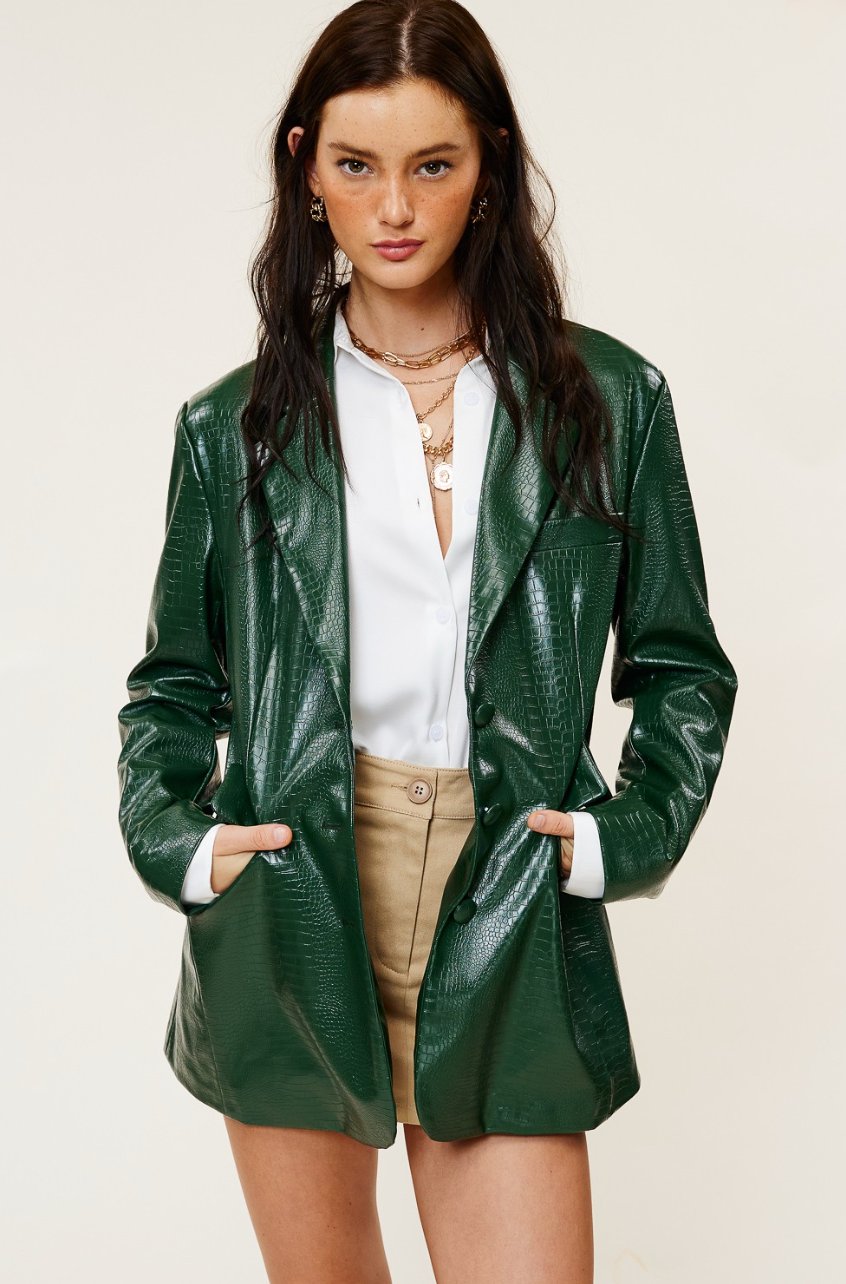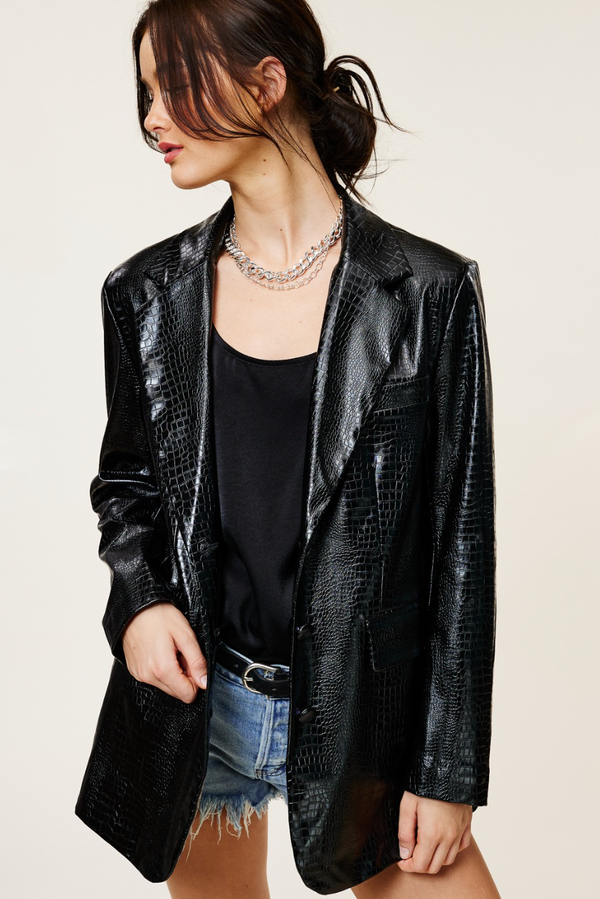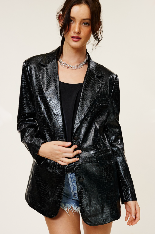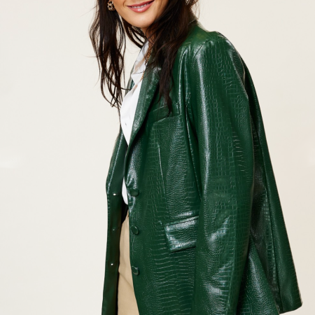 Cassandra Faux Leather Croc Blazer comes in this trendy croc faux leather design. This vegan leather blazer comes in black and hunter green with notched lapels, and a button closure. This jacket is the perfect addition to be the most fashionable at work.