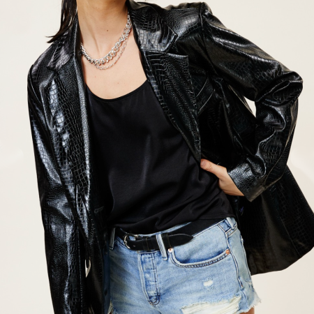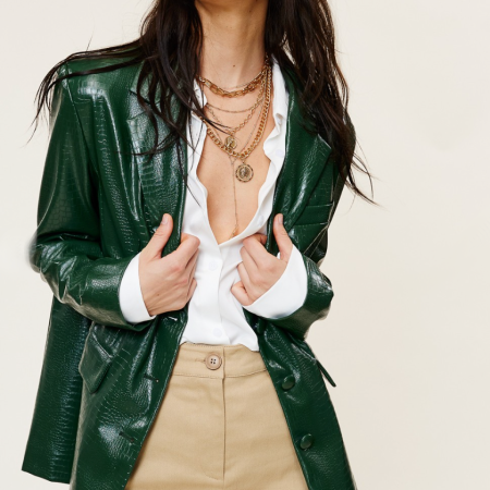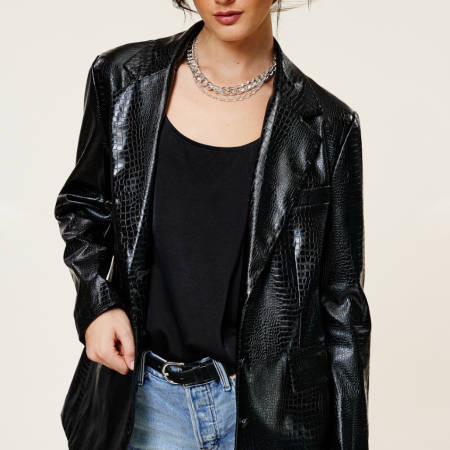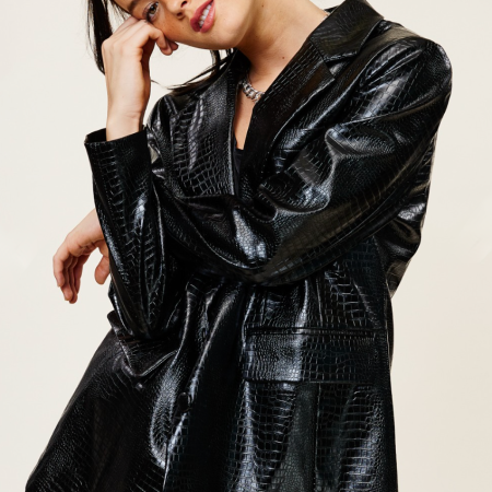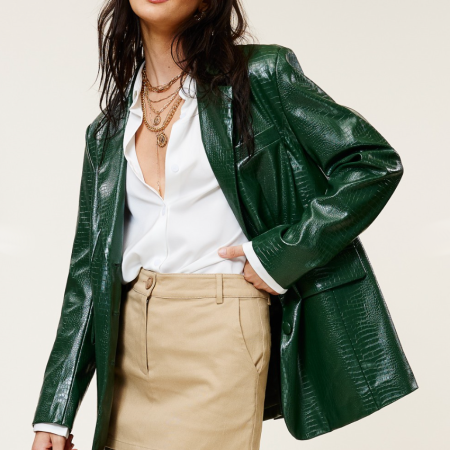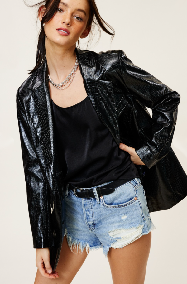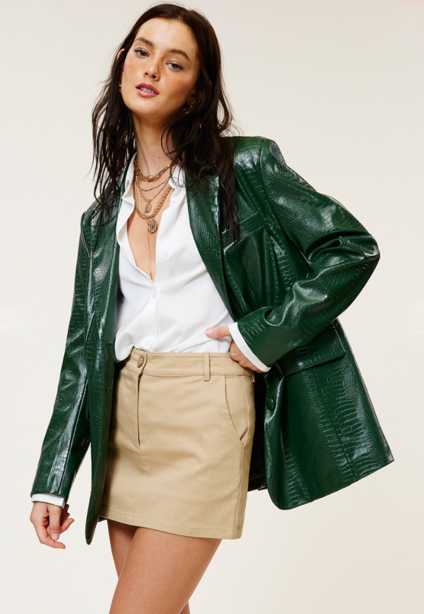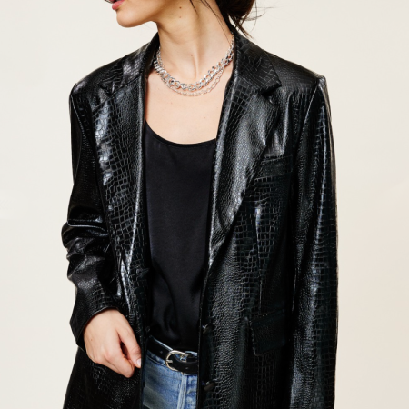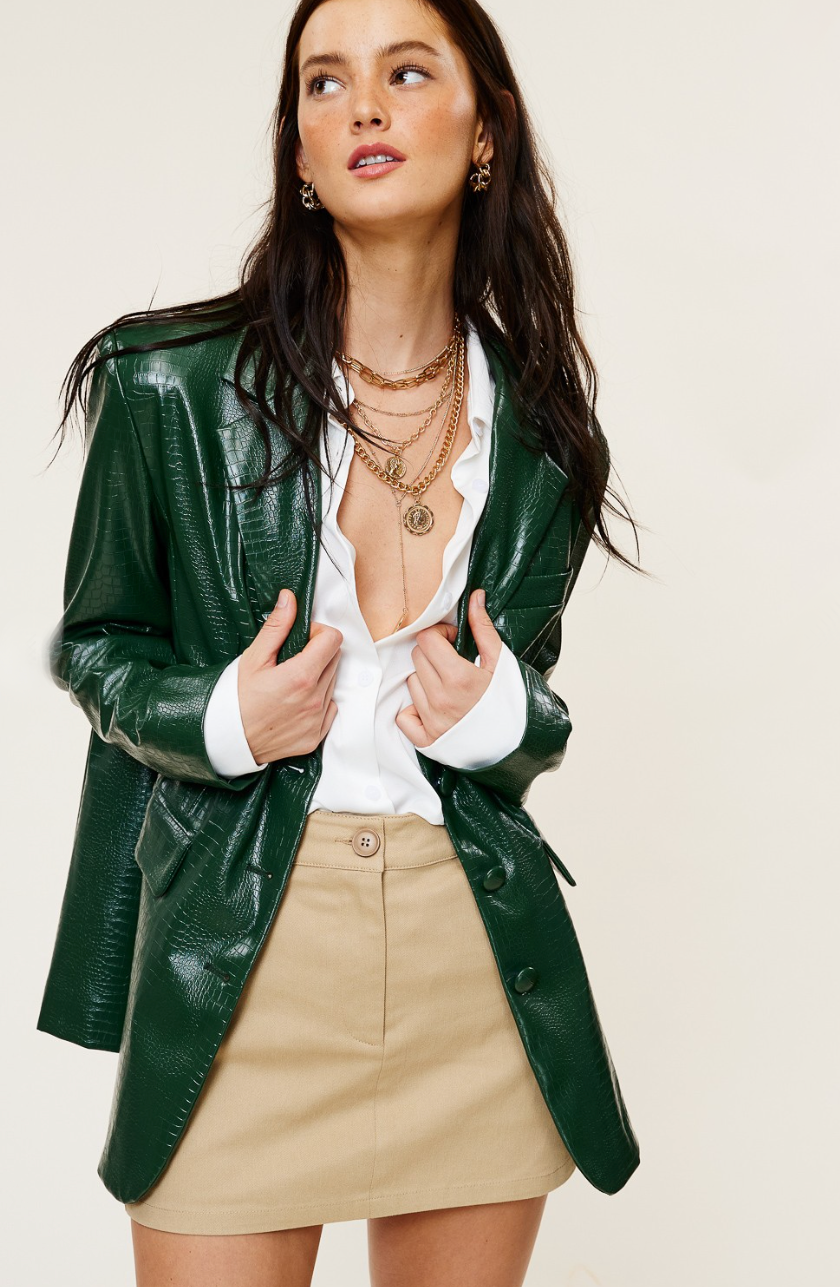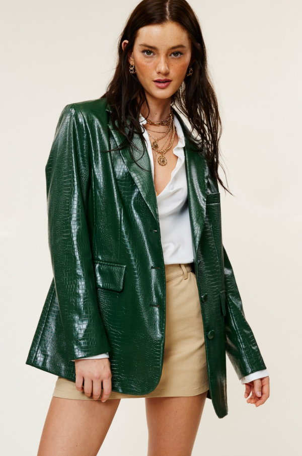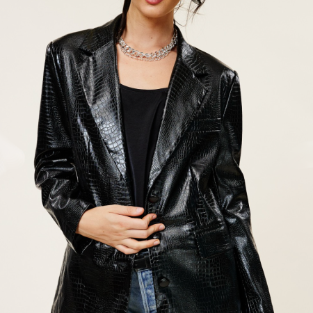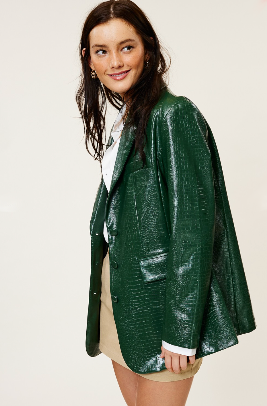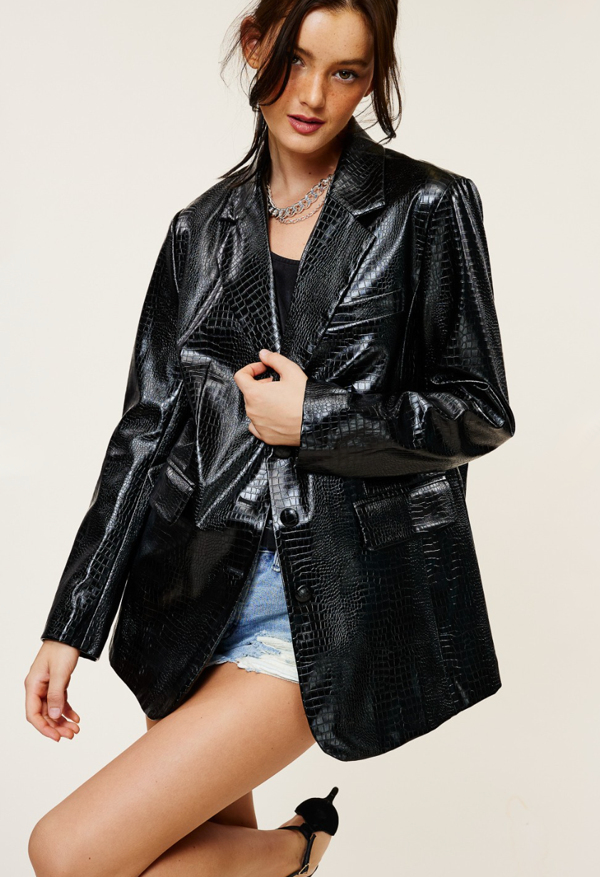 Cassandra Faux Leather Croc Blazer comes in this trendy croc faux leather design. This vegan leather blazer comes in black and hunter green with notched lapels, and a button closure. This jacket is the perfect addition to be the most fashionable at work.