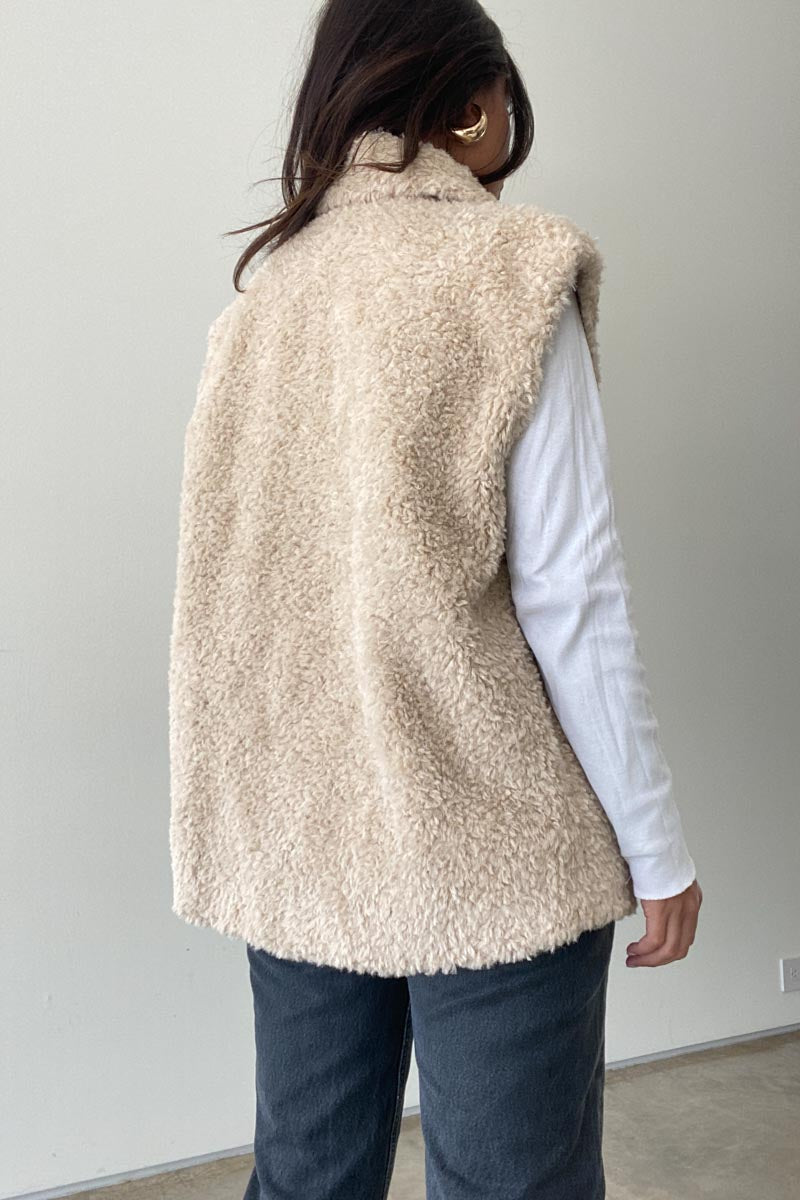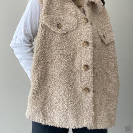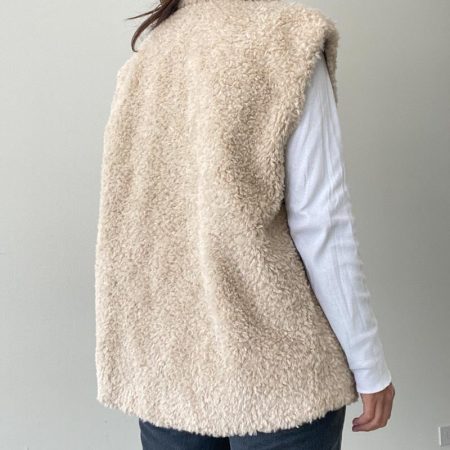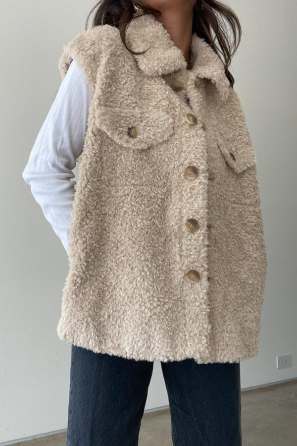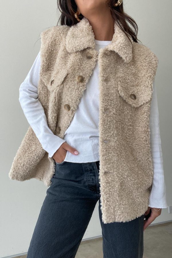 This Charleston Vest is the ultimate winter wardrobe staple. It is crafted from a luxurious creamy beige faux fur sherpa like material that is incredibly soft to the touch. The vest features a button down closure and is sure to keep you warm and chic all season long.