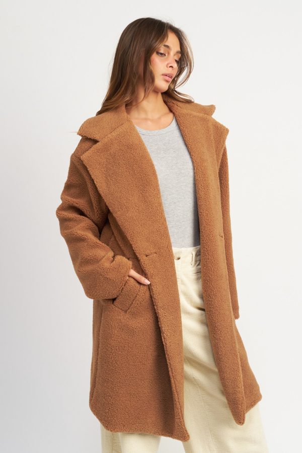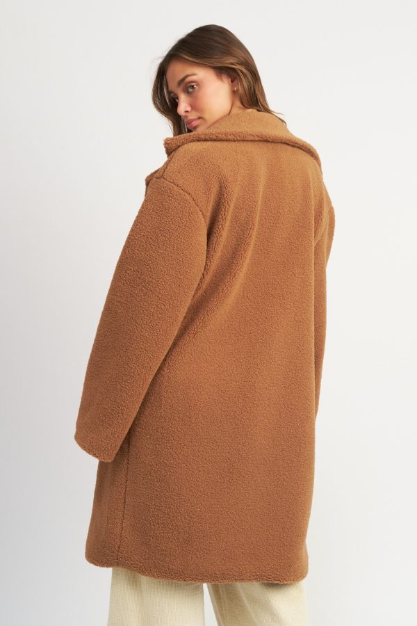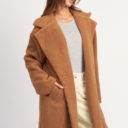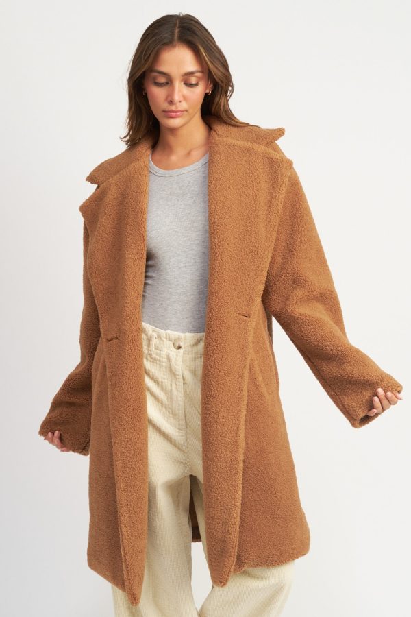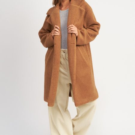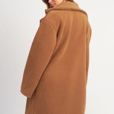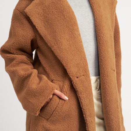 Defined by its trendytrench coat silhouette, the Chelsea Teddy Coat brings warmth and comfort to your wardrobe. Crafted with a luxuriously soft teddy texture, the rust colored coat features a double breast collar and a long fitted profile for a classic look.