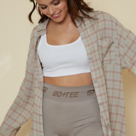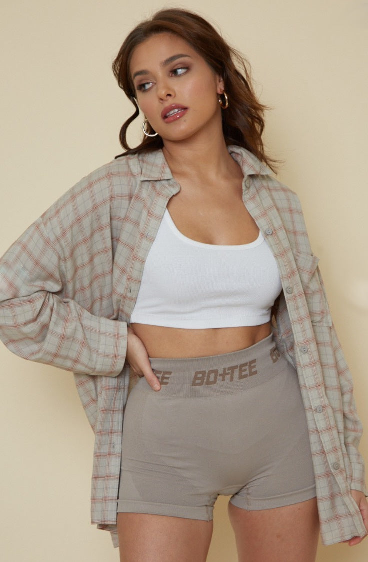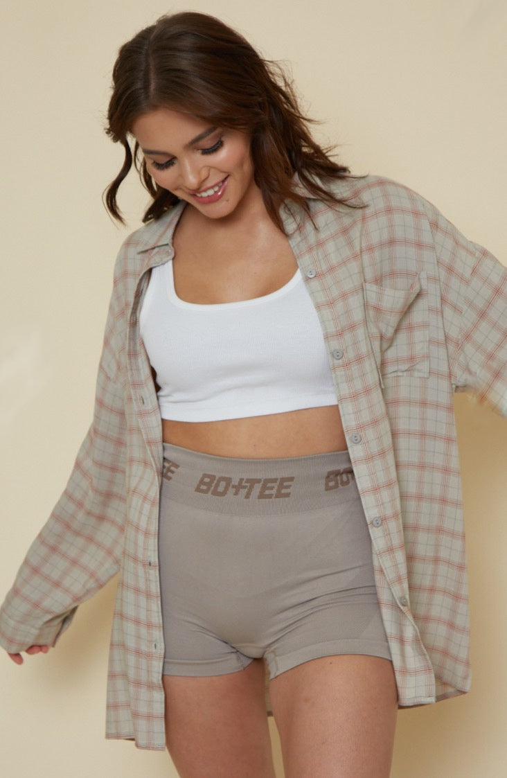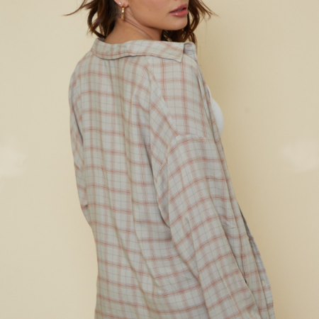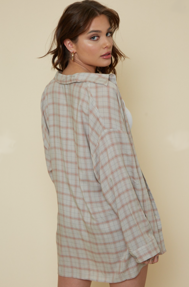 Its officially plaid season babes and our new Cool The Jets Plaid Shirts are here. This is our light version with light Gray + Red colors in it. This can be thrown on top of your fave fall outfit. This is a simple plaid long sleeve with a button up feature in the front and collared top. This button up is oversized!