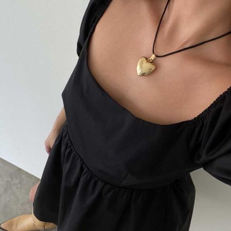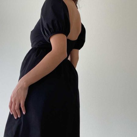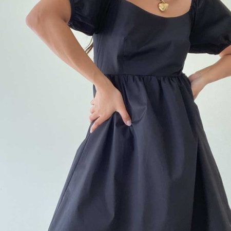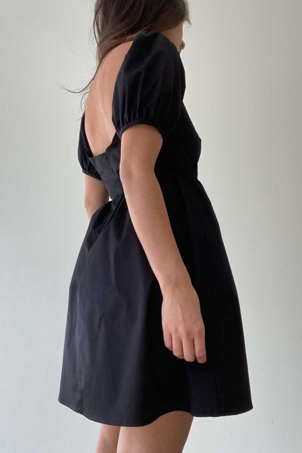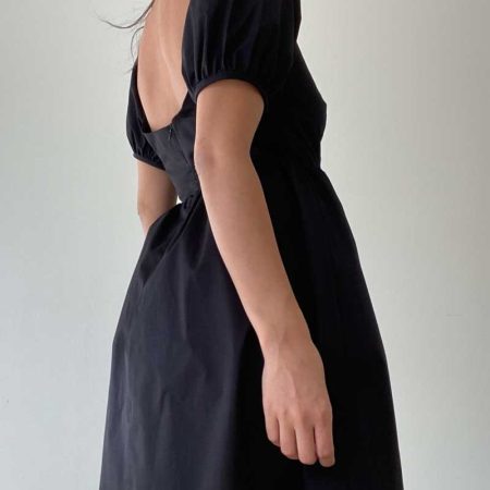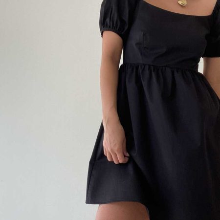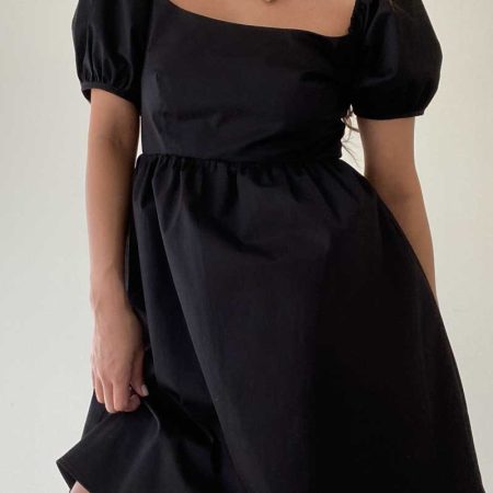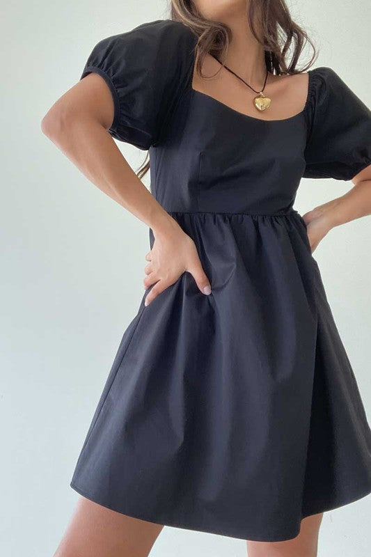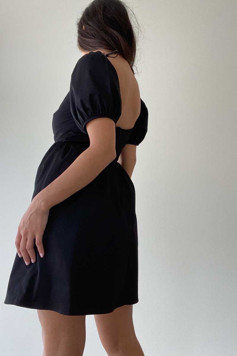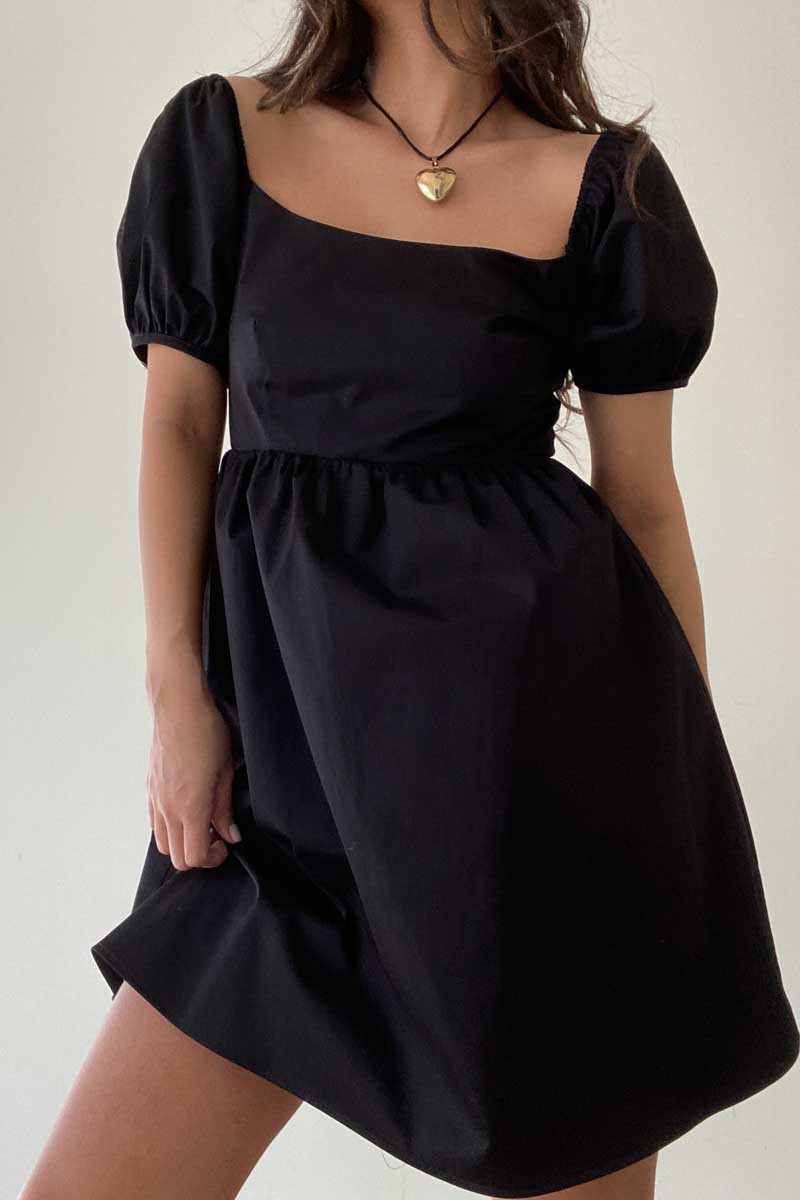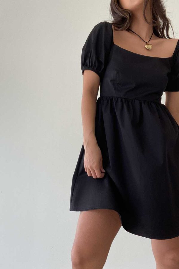 The Dolly Dress is a sleek black mini dress featuring slightly puffed sleeves for a touch of femininity. The lightweight and breathable fabric provides all-day comfort, making it perfect for any occasion.