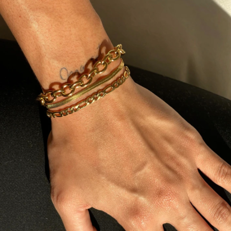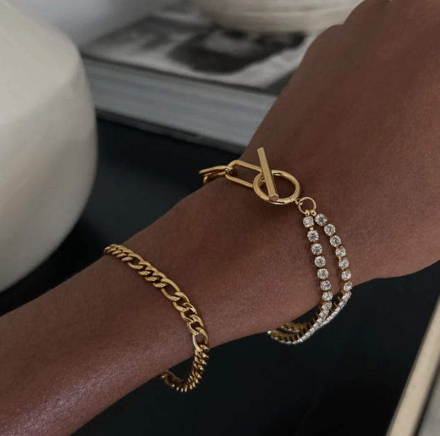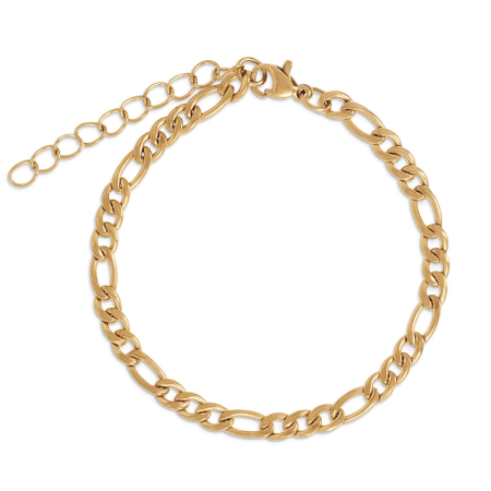 Bare Rags is happy to introduce Ellie Vail Jewelry to our jewelry collection. The EllieVail Zara Figaro Chain Bracelet is water resistant, tarnish free, low maintenance, and hypoallergenic. The Zara Figaro Chain Bracelet gold plated and stainless steel material. Features this stunning and timeless cuban link design and the size is adjustable around your waist.