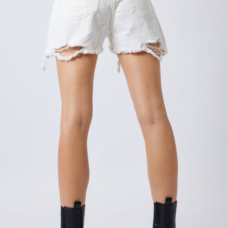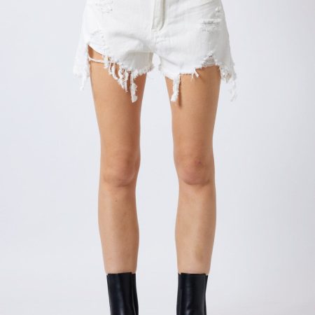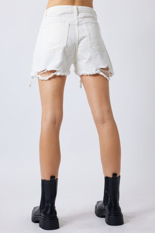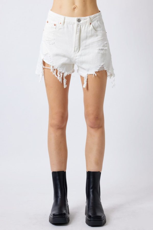 New Emmy Shorts are white distressed high waisted shorts that are perfect for this spring and summer. These white denim shorts are essential for your spring and summer wardrobe, and can be used to style with some many different outfits. These classic distressed high waisted shorts feature a classic center button down closure with a zipper and belt loops.