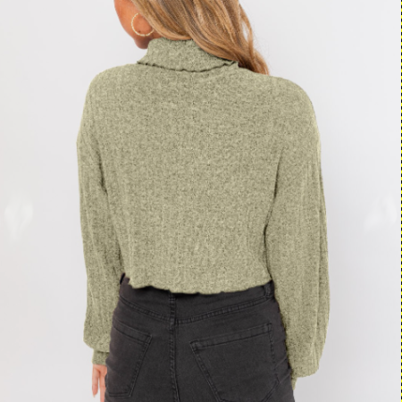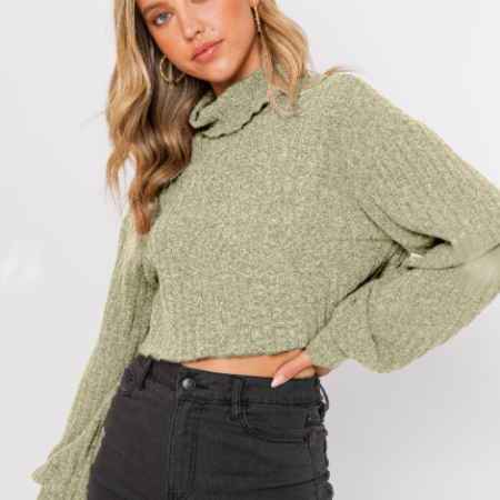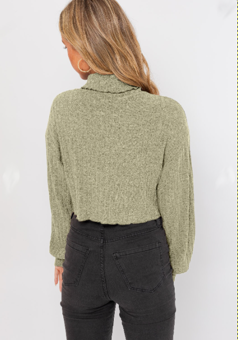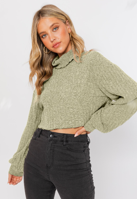 Fran Sweater comes in this stunning sage green color. This cozy cropped sweater features a loose turtleneck with flowy long sleeves. Fran Sweater is perfect for fall and can be styled with your favorite jeans or leather pants.
