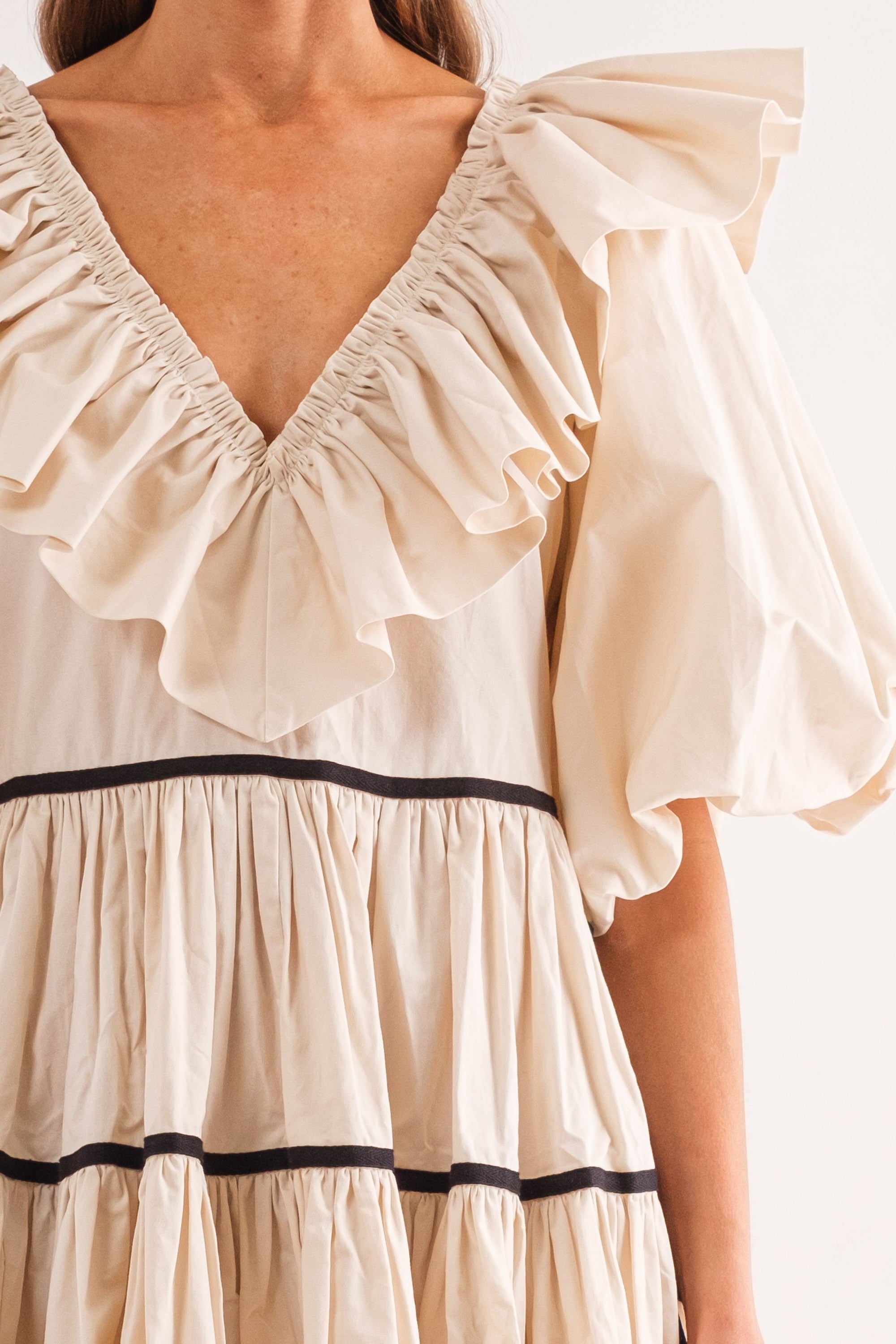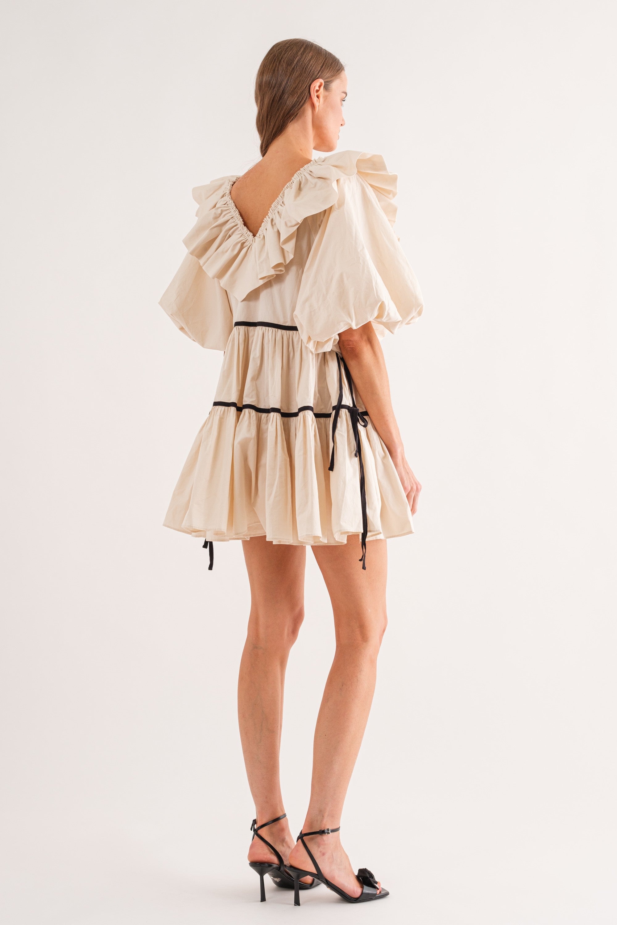 Introducing the Hazel Mini Dress – the perfectaddition for any wardrobe. Crafted from a luxury lightweight material, this dress is designed with a ruffle design V neckline and features an ultra-feminine combination of black and cream detailing. Further enhanced with billowy puff sleeves, this lovely babydoll dress creates a flattering look for any body type.