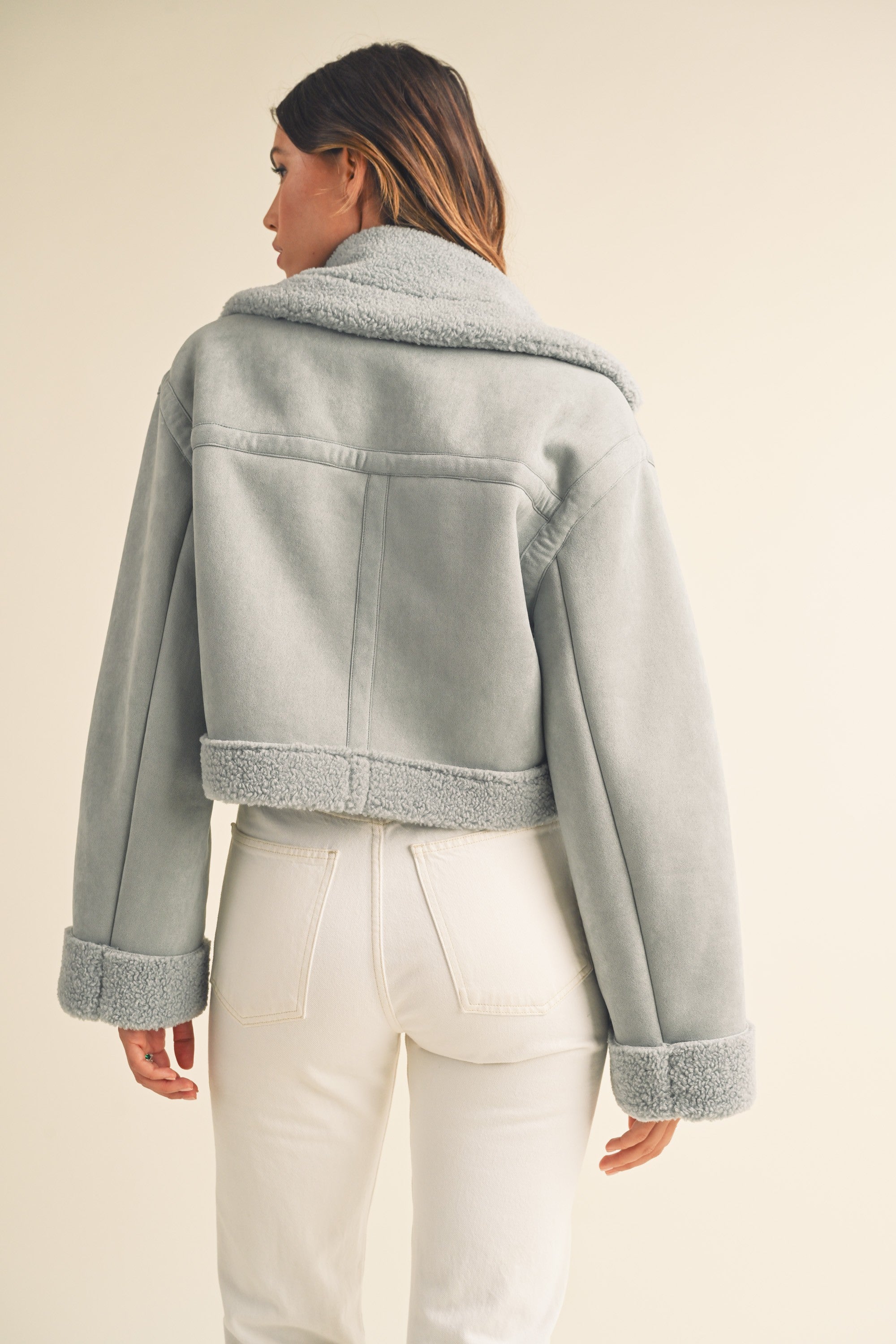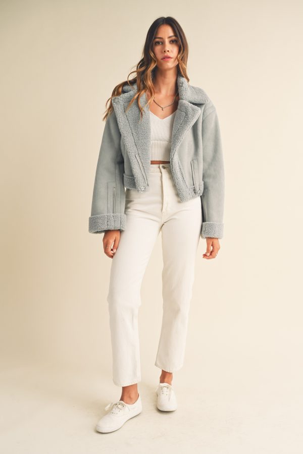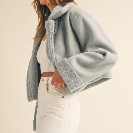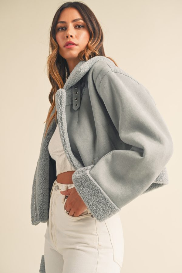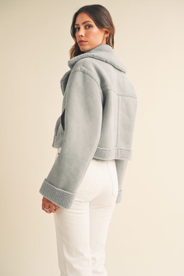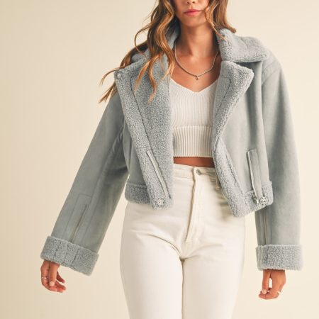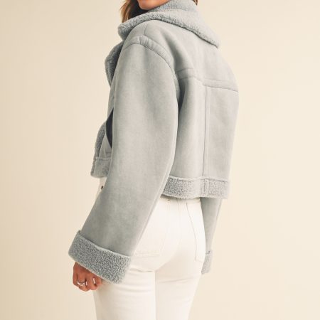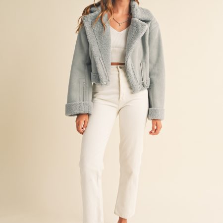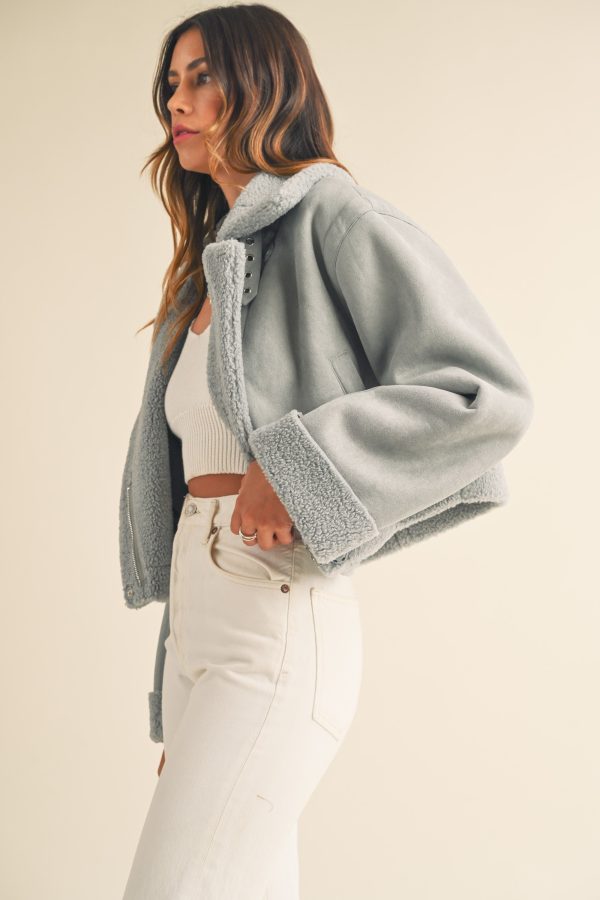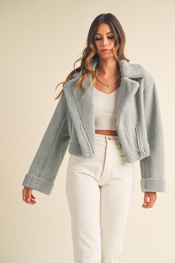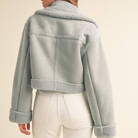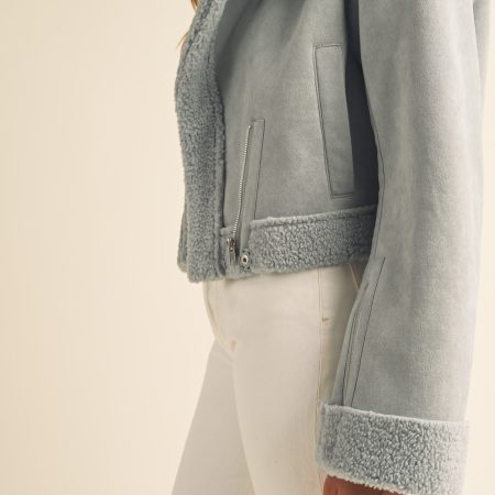 The Heidi Jacket is a luxurious outerwear piece made from premium dusty blue suede and Sherpa lining. This moto cropped design will keep you warm and stylishly cozy in the cooler months.