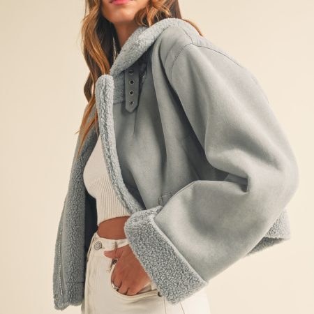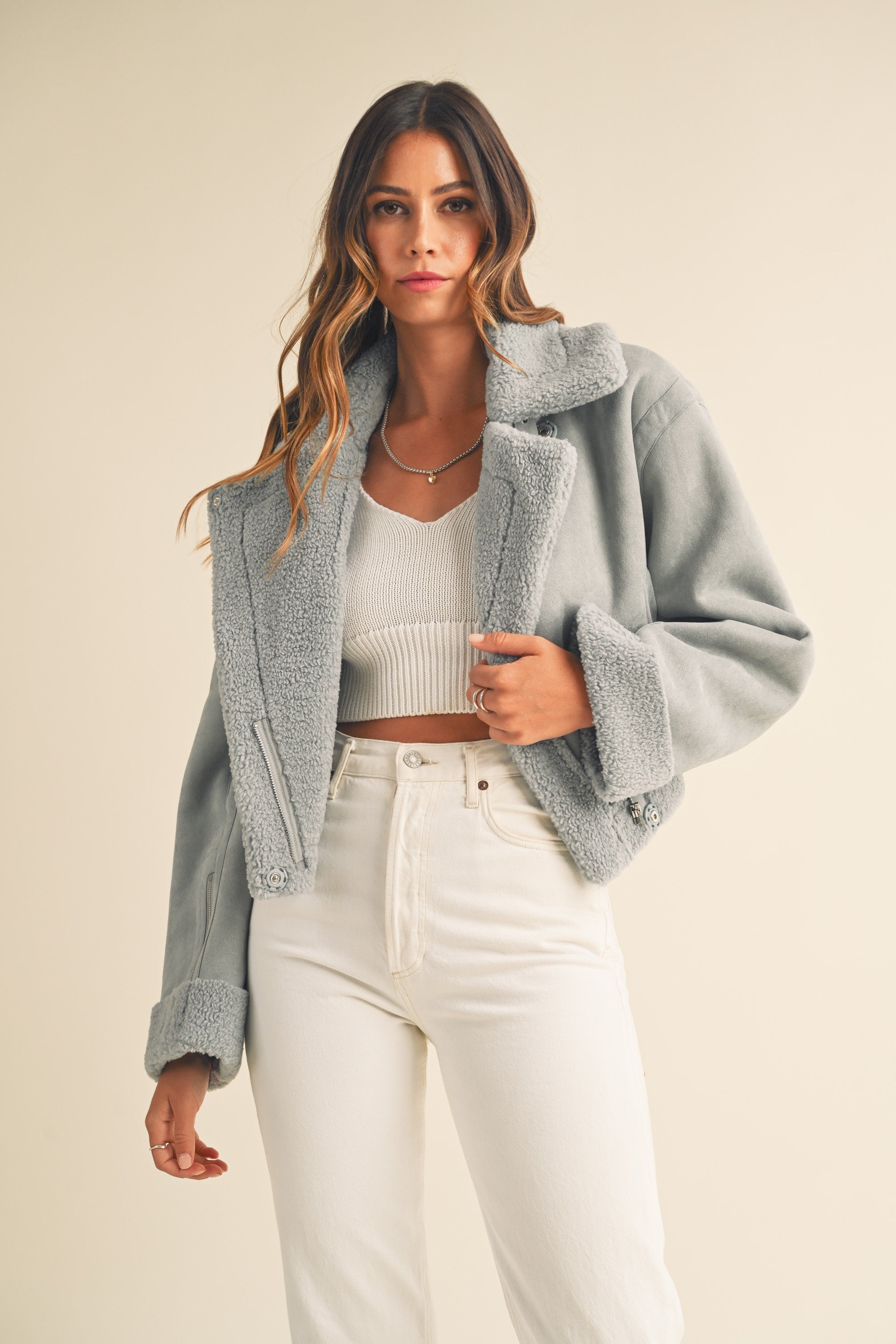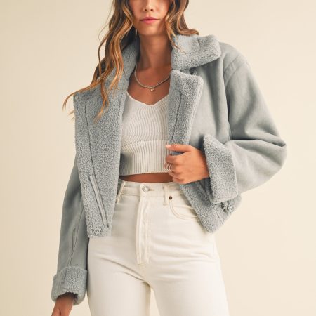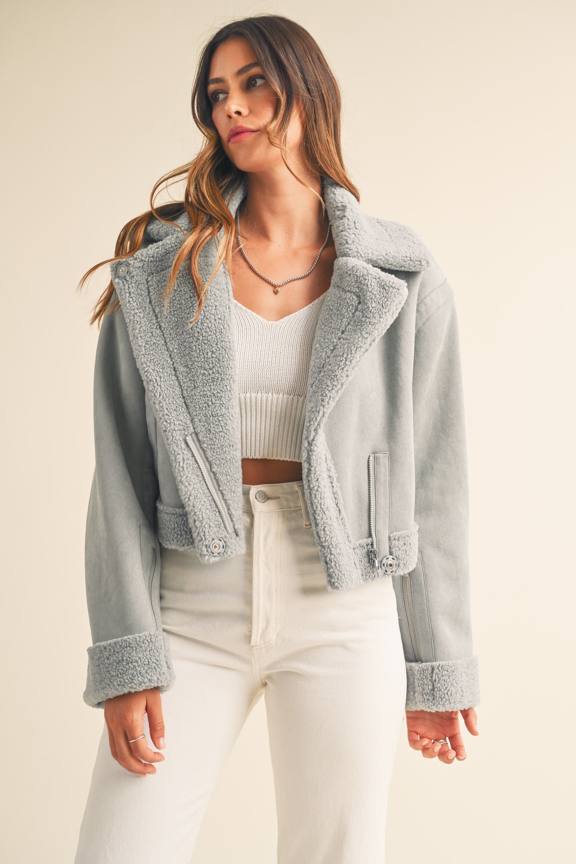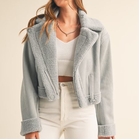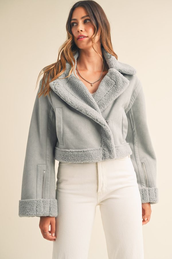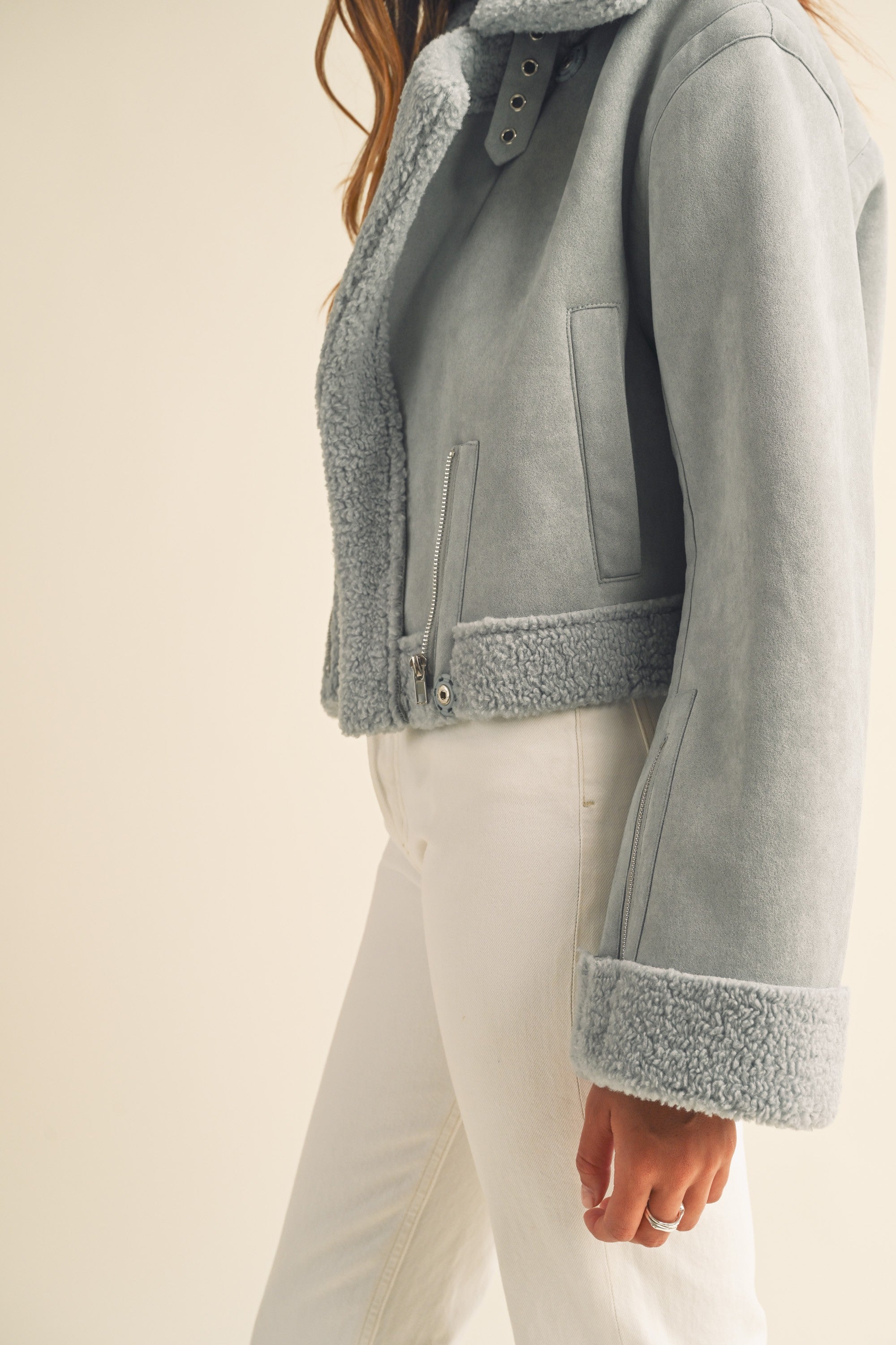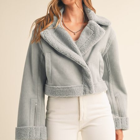 The Heidi Jacket is a luxurious outerwear piece made from premium dusty blue suede and Sherpa lining. This moto cropped design will keep you warm and stylishly cozy in the cooler months.