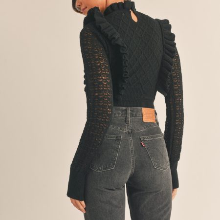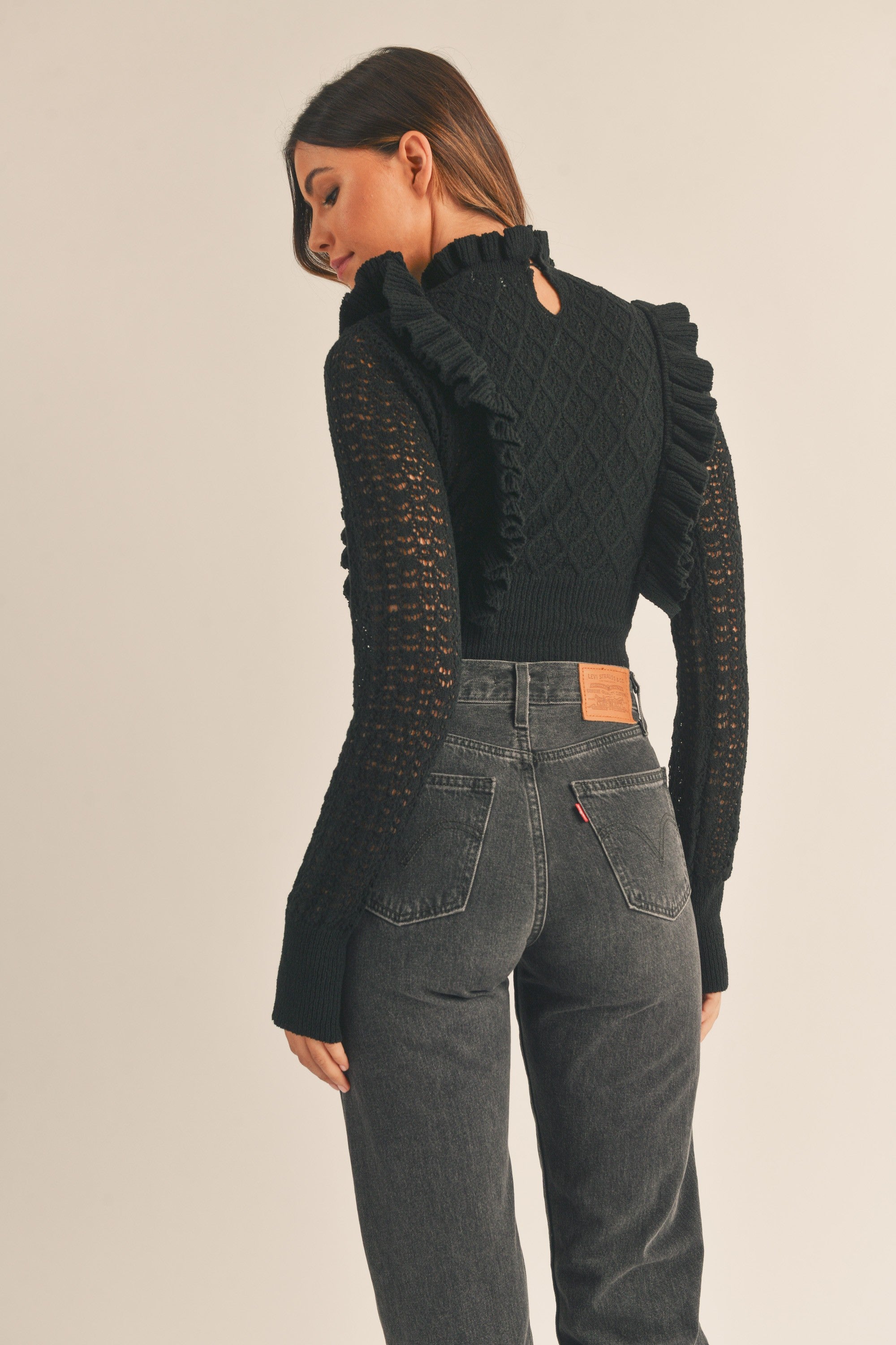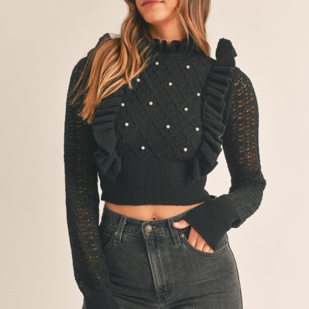 The Hollan Pearl Sweater is perfect for any sophisticated wardrobe. Featuring a black hue and slightly cropped fit, this classic piece is accented with ruffle and pearl detailing for atrendy touch. Wear it with jeans and heels for an effortless yet chic look.