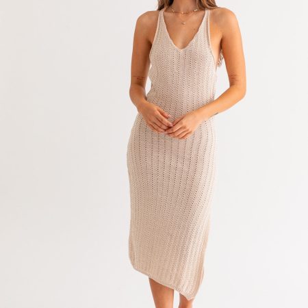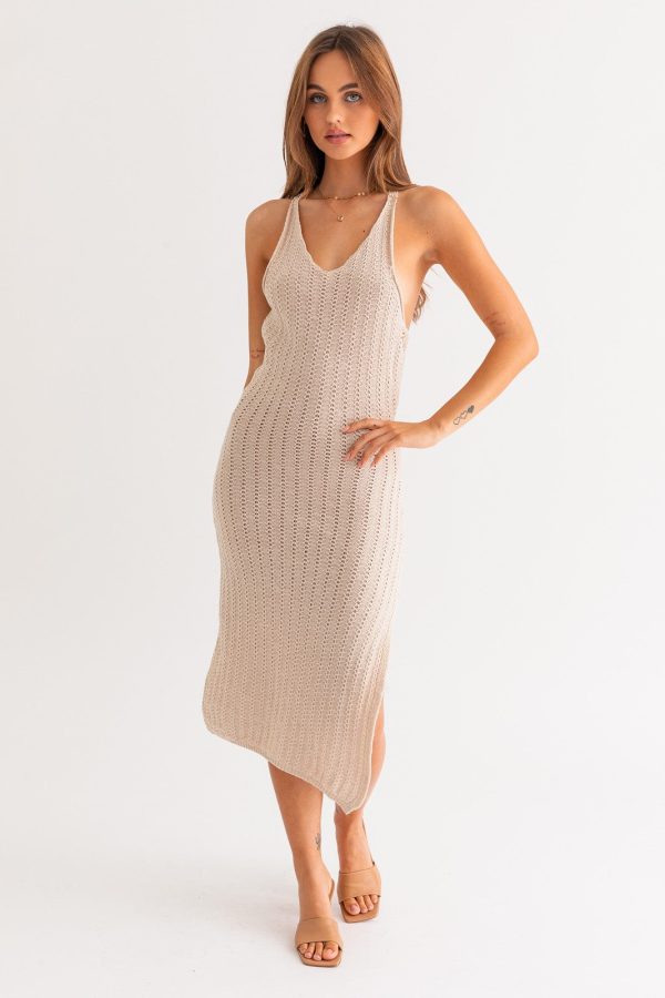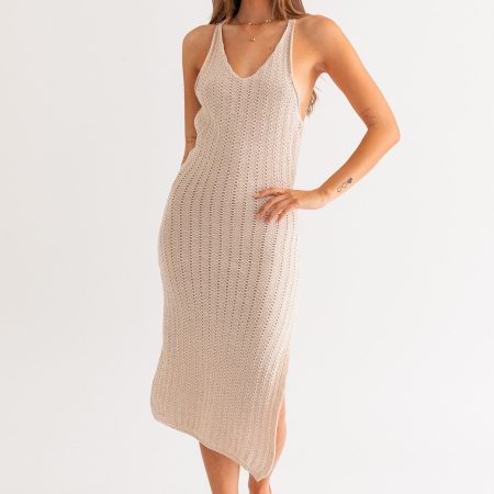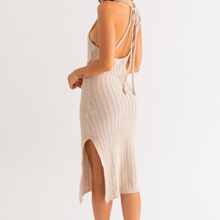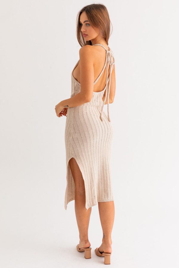Huntington Dress is the newest addition to our spring and summer dress collection. This midi dress comes in this stunning cream color and knit fabric. This dress features a side slit and an adjustable halter neck with thick rope ties, making it super trendy and different. The knit sweater design make this midi dress elegant and feminine.