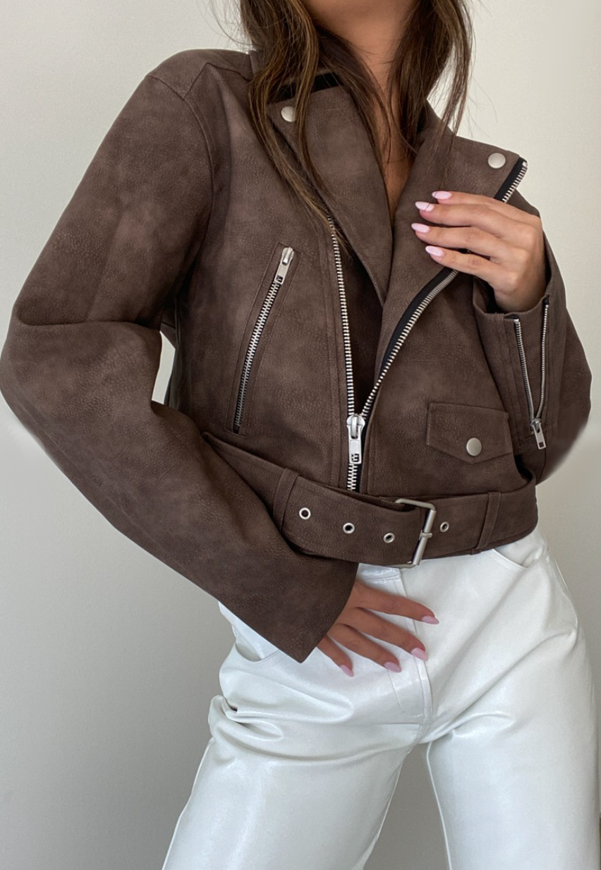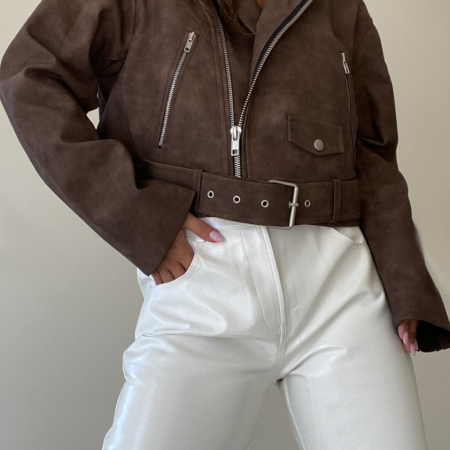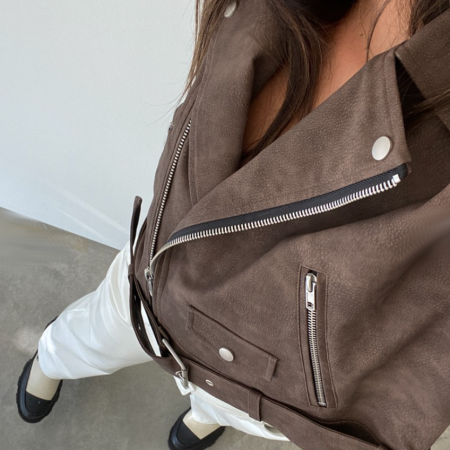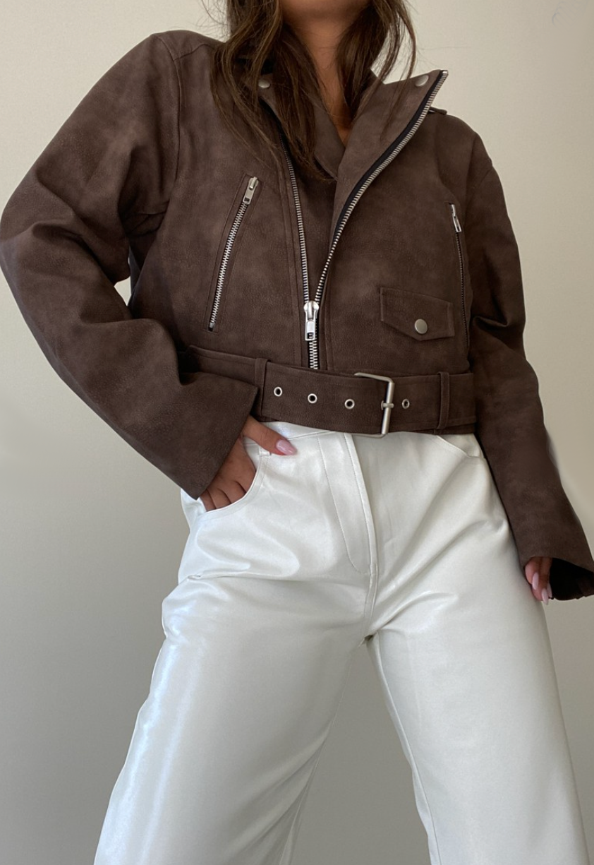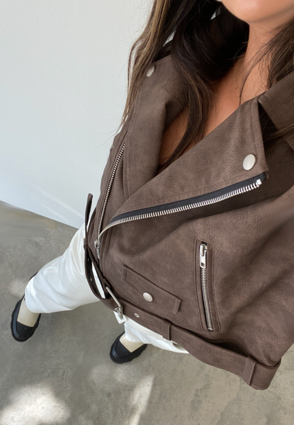 New Hutton Oversized Faux Leather Jacket is your new fave fall jacket. This oversized leather jacket comes in this washed dark brown color. This leather jacket comes with a waist belt and a classic zipper closure.