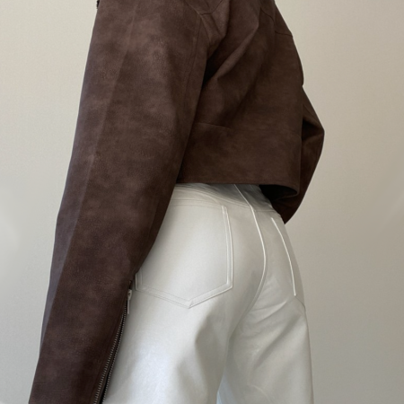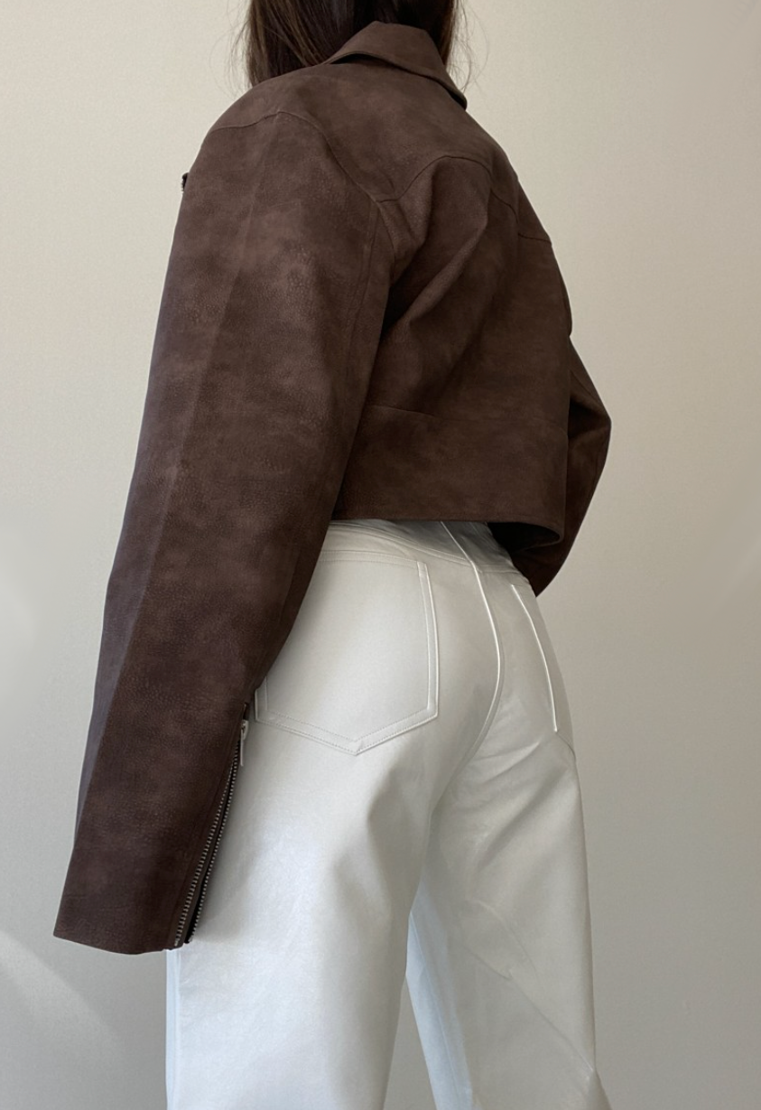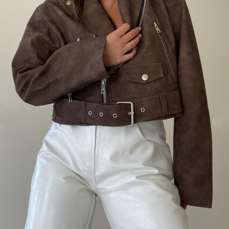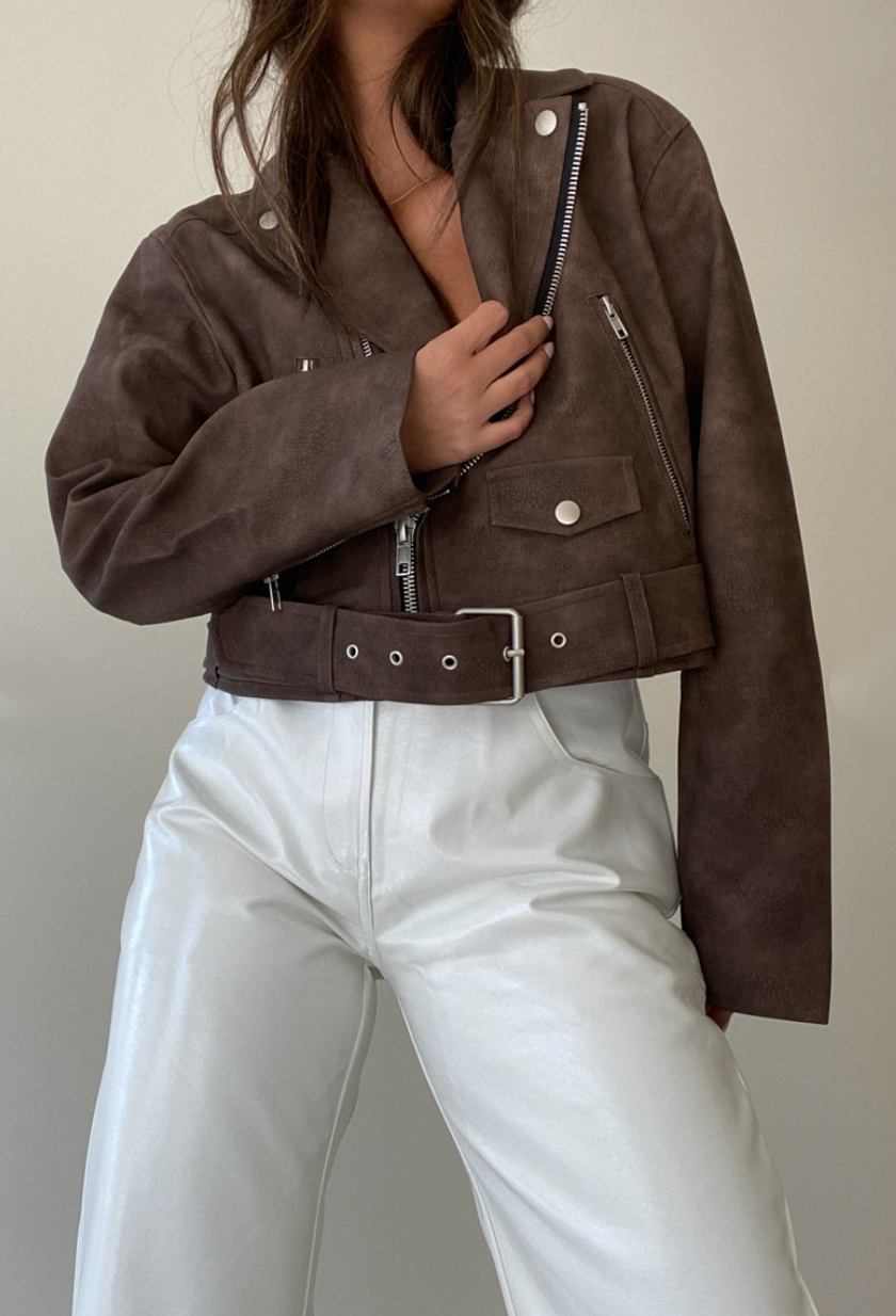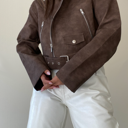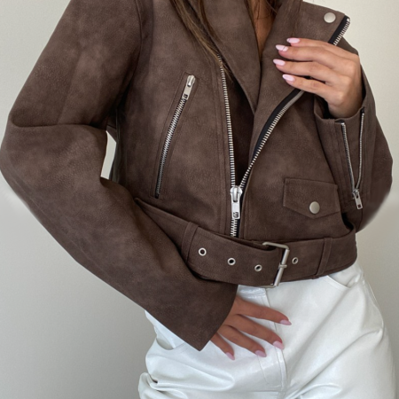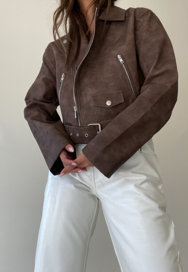New Hutton Oversized Faux Leather Jacket is your new fave fall jacket. This oversized leather jacket comes in this washed dark brown color. This leather jacket comes with a waist belt and a classic zipper closure.