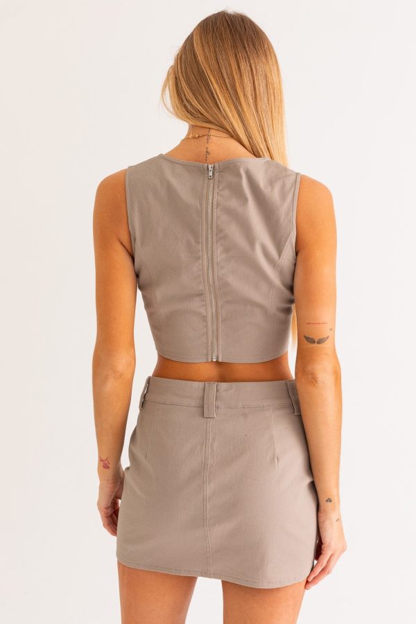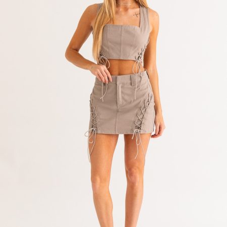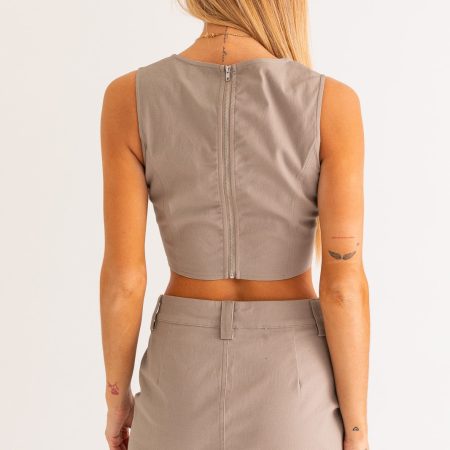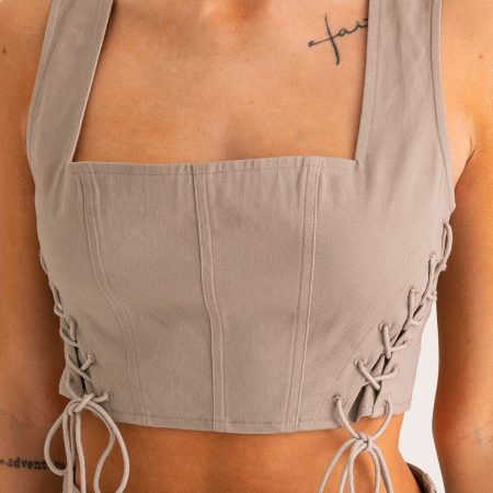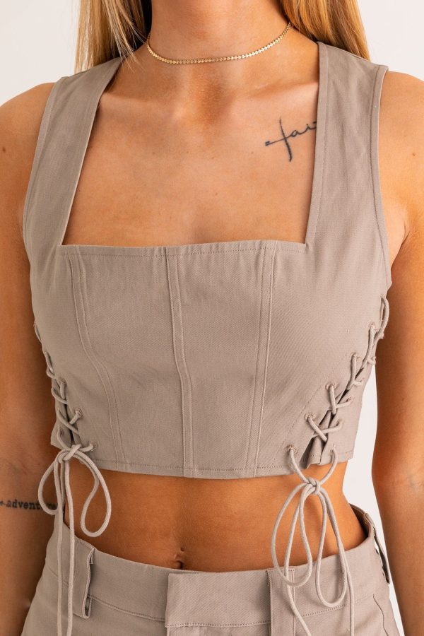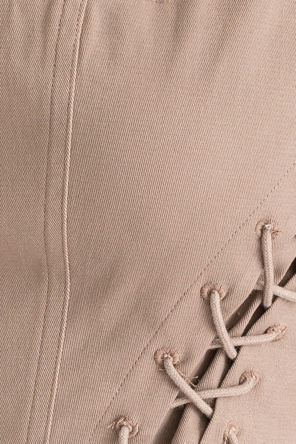 The Jasmine Lace Up Top features a taupe color, a zipper back, and a corset-like design. The cropped design adds an edgy yet elegant feel, perfect for a night out. Its the perfect top for all my babes looking to spice up their wardrobe.