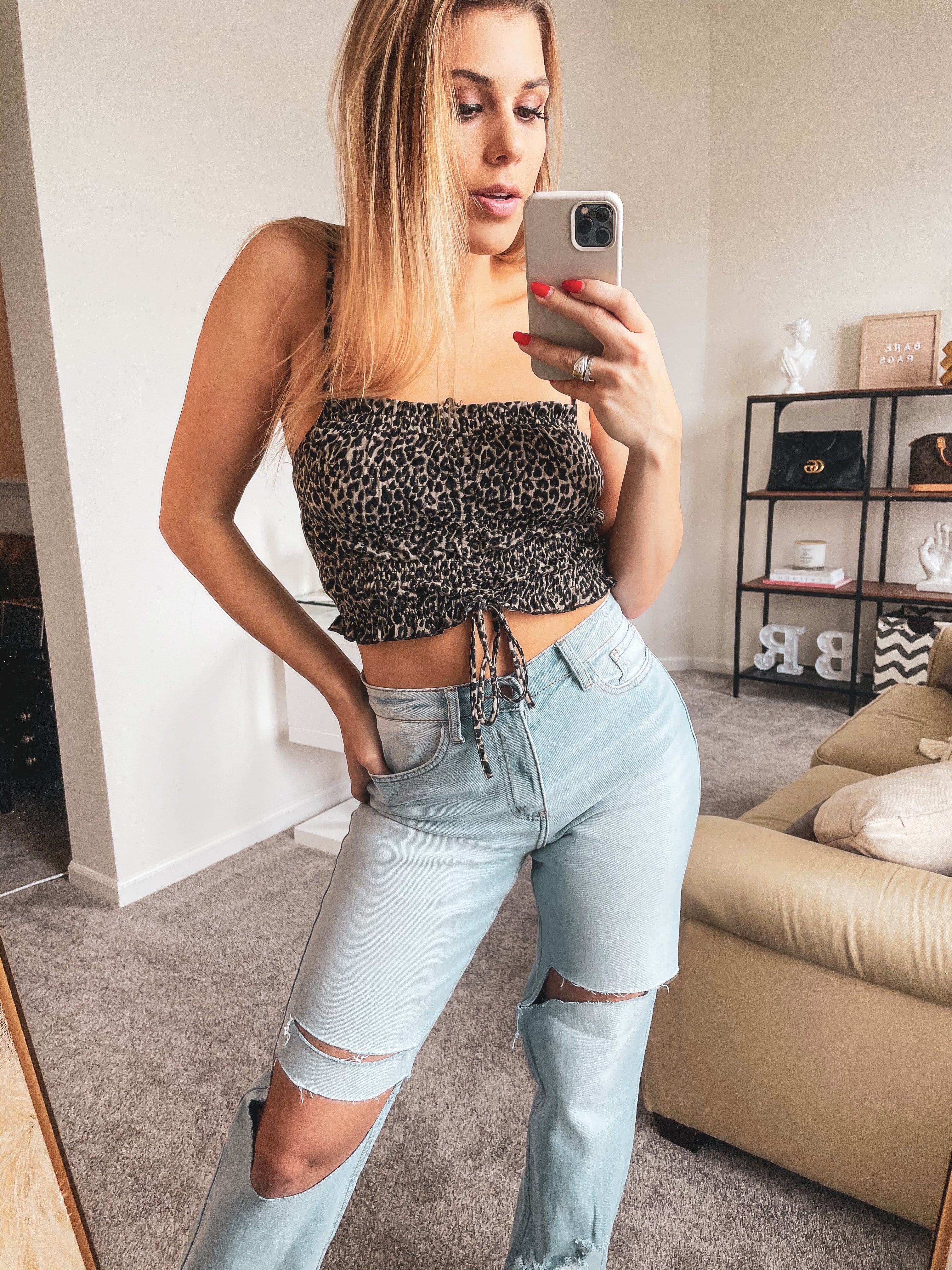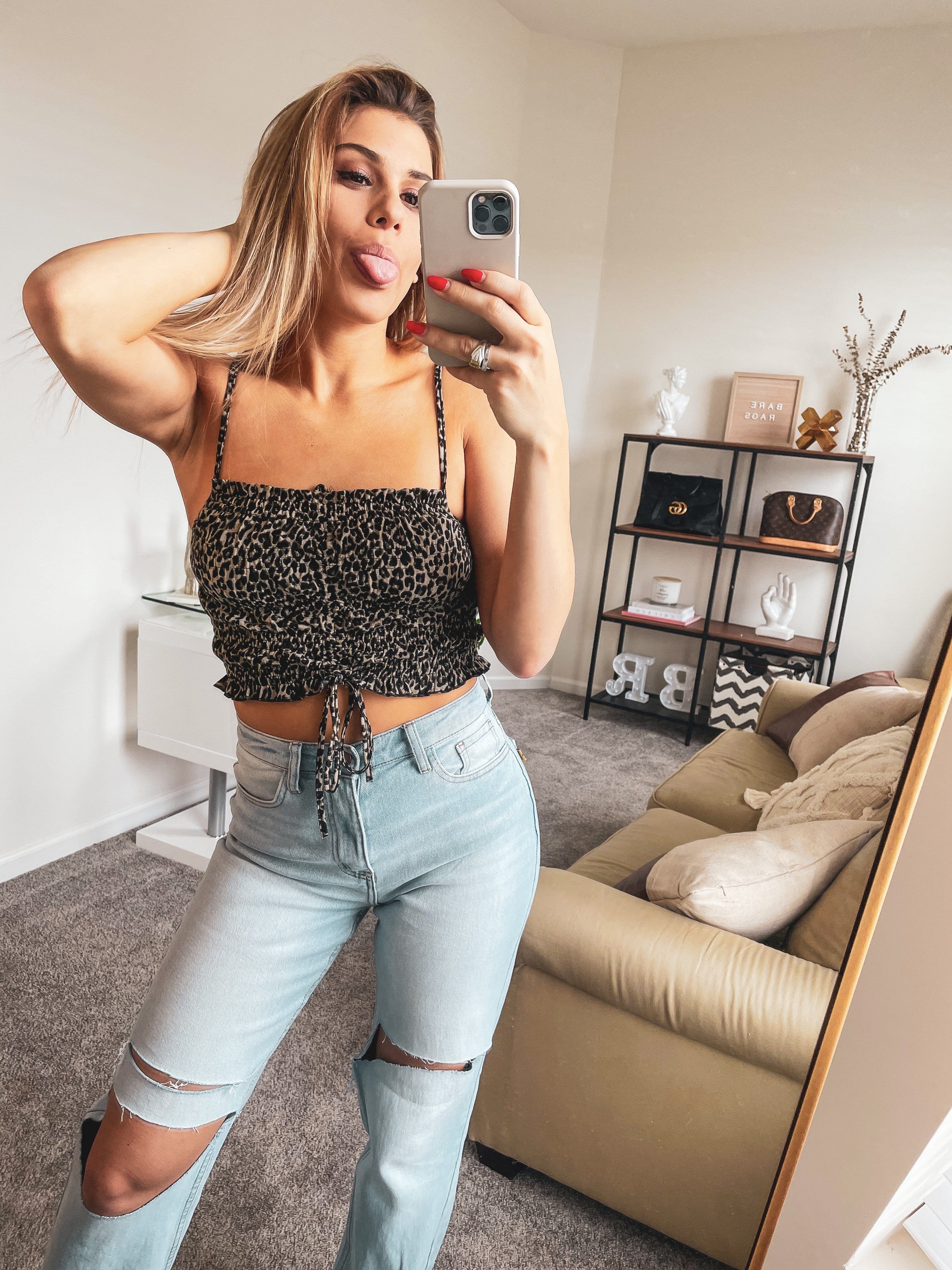 Leopard Spotted Crop Cami is apart of Bare Rags new summer and spring collection. This top can be worn as a cami or a tube top by tucking in the straps. The leopard print on this crop top make this top spicy, and the material is soft stretch cotton and is super comfy and breathable.