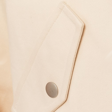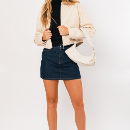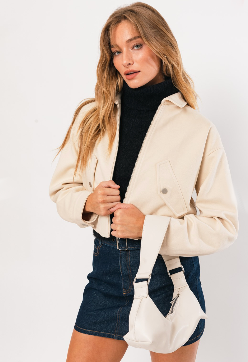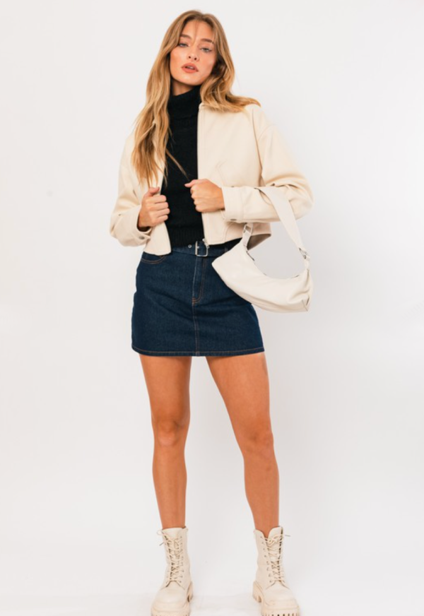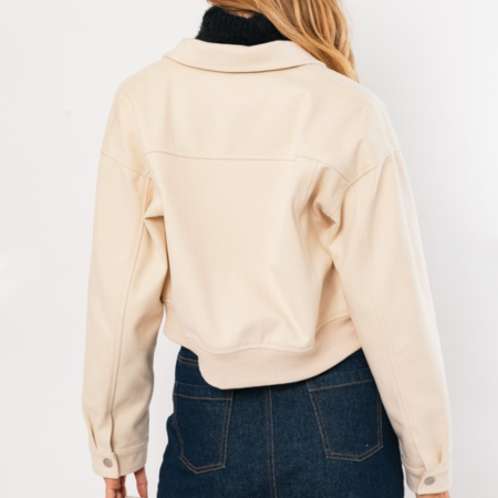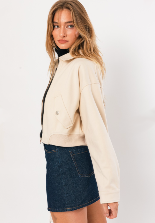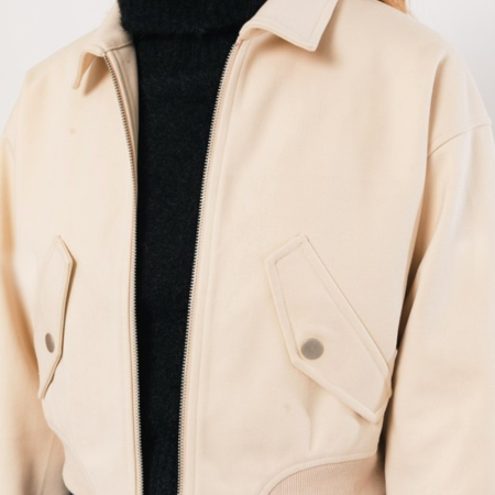 London Jacket comes in this light creamy color and can be styled for almost any season. This jacket is slightly cropped and comes with a classic zipper front closure and collar top. The London Jacket has two front button pockets and slightly fitted waistband making it super flattering.