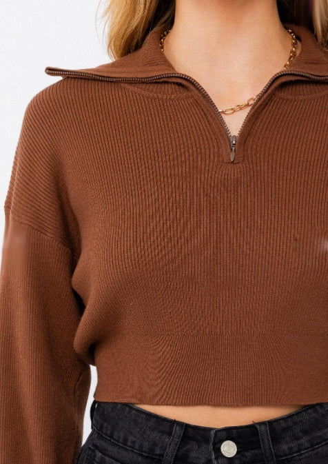 Micheala Crop Sweater has arrived in perfect timing for Fall and Winter babe.Micheala Crop Sweater features a soft ribbed material that feels so luxurious. This sweater has long sleevesand a cropped design. It features a college like quarter zip and is super trendy for fall outfits.