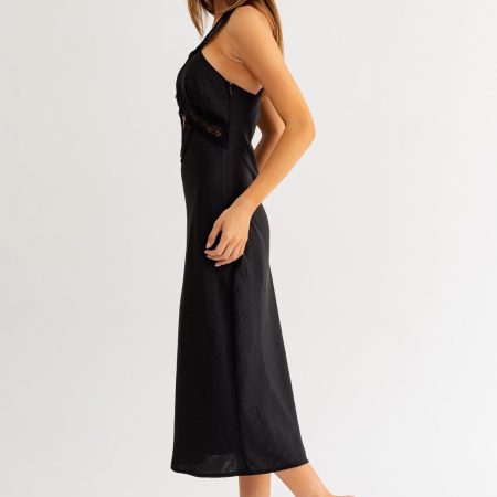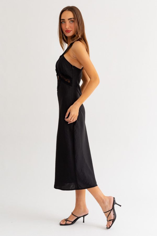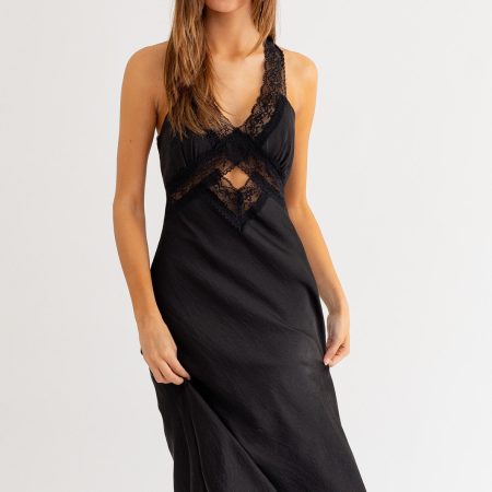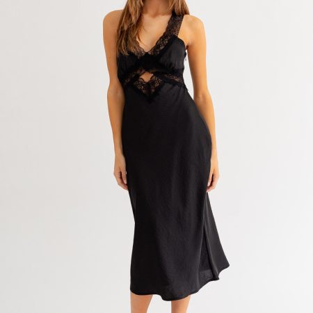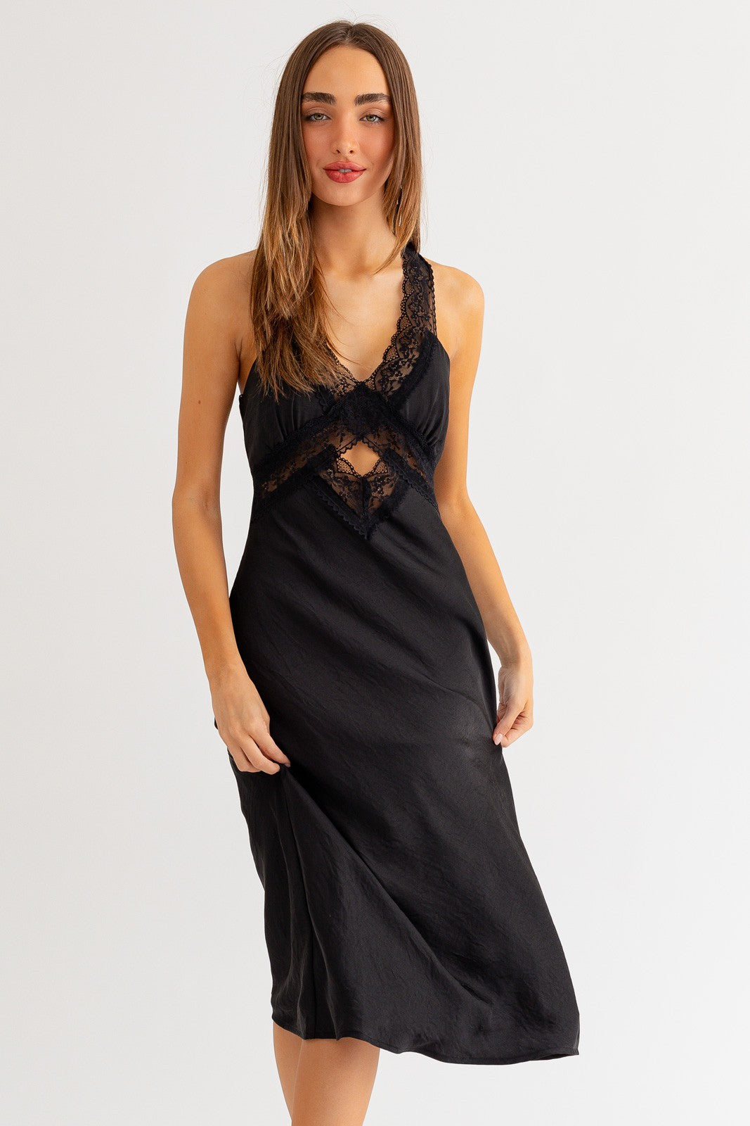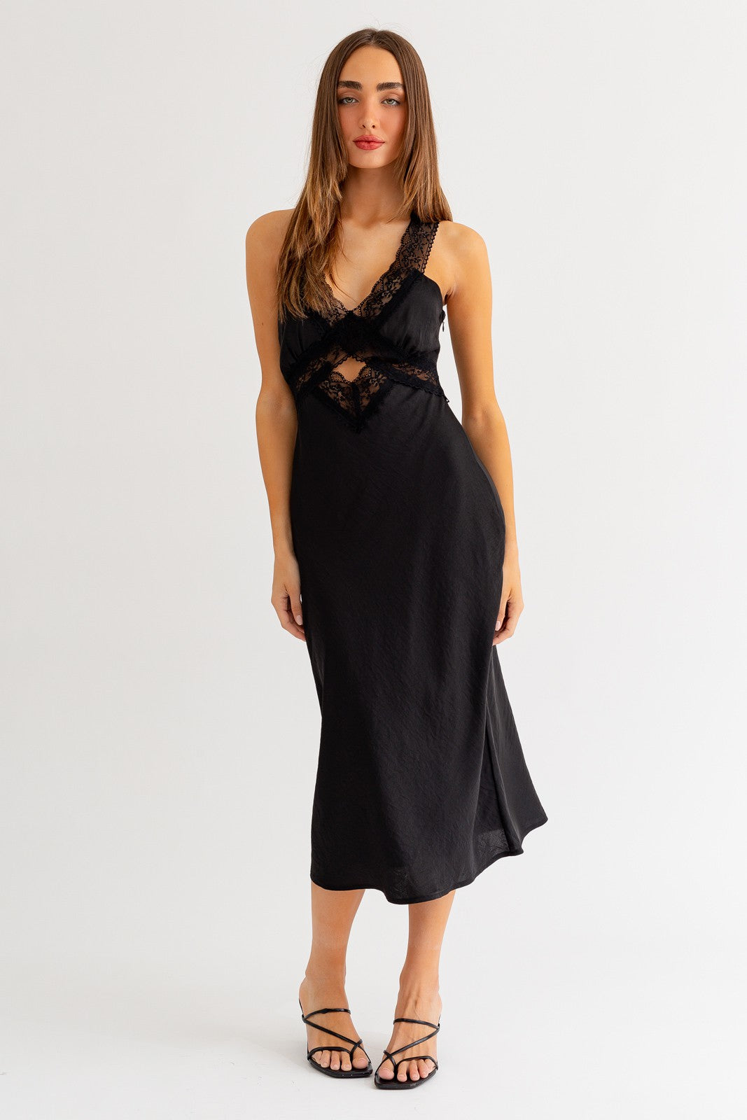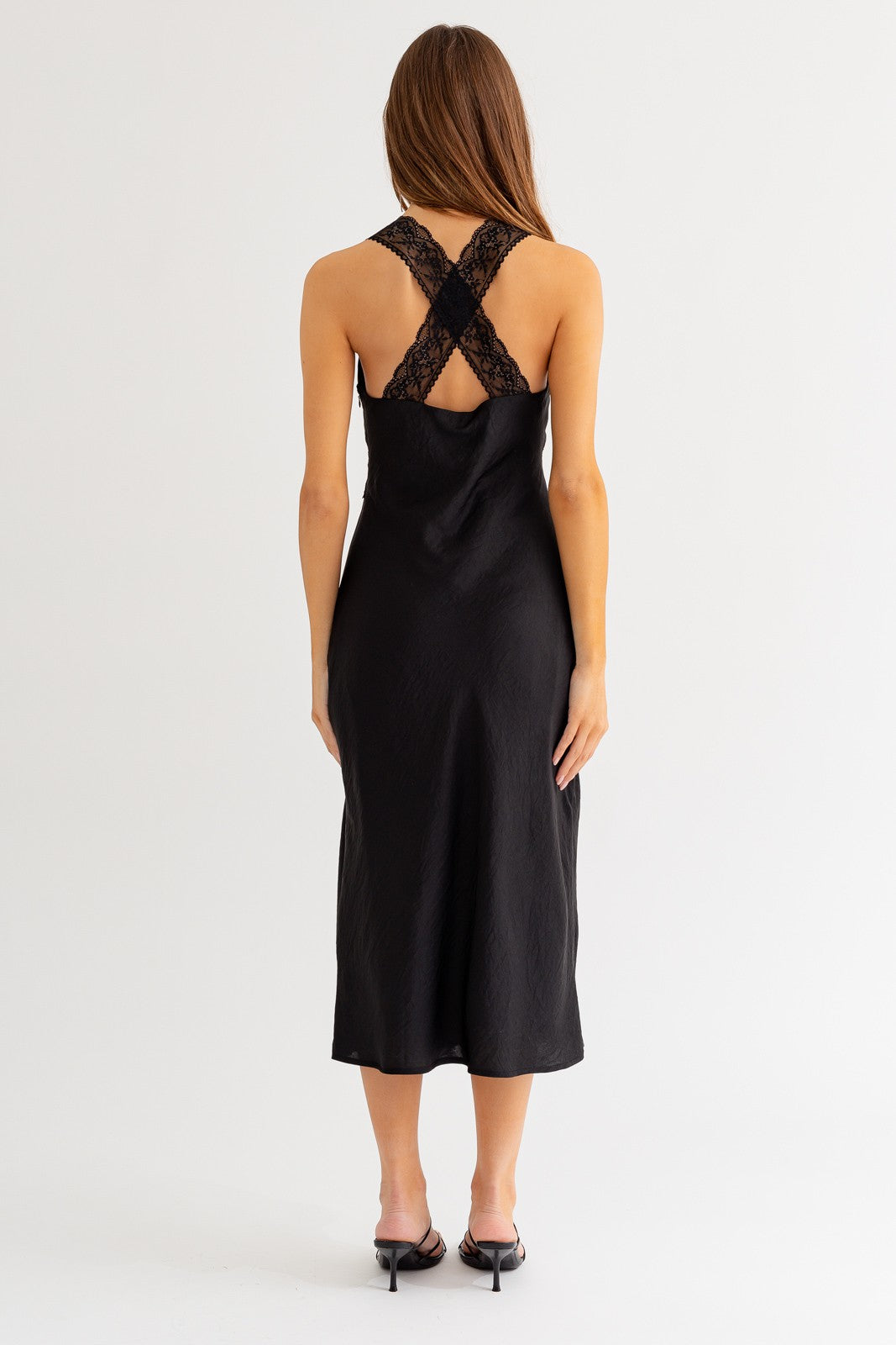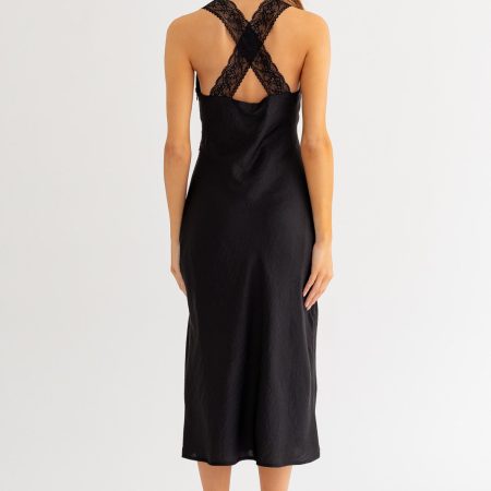 The Naomi Lace Dress is an elegant midi dress that is sure to make a statement. Featuring a sleek black satin-like fabric, this dress is sure to be the star of any special occasion. Easily can be dressed up or down, this dress is a must. With its timeless silhouette, you’re sure to look chic and sophisticated in this beautiful piece.