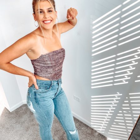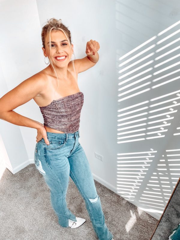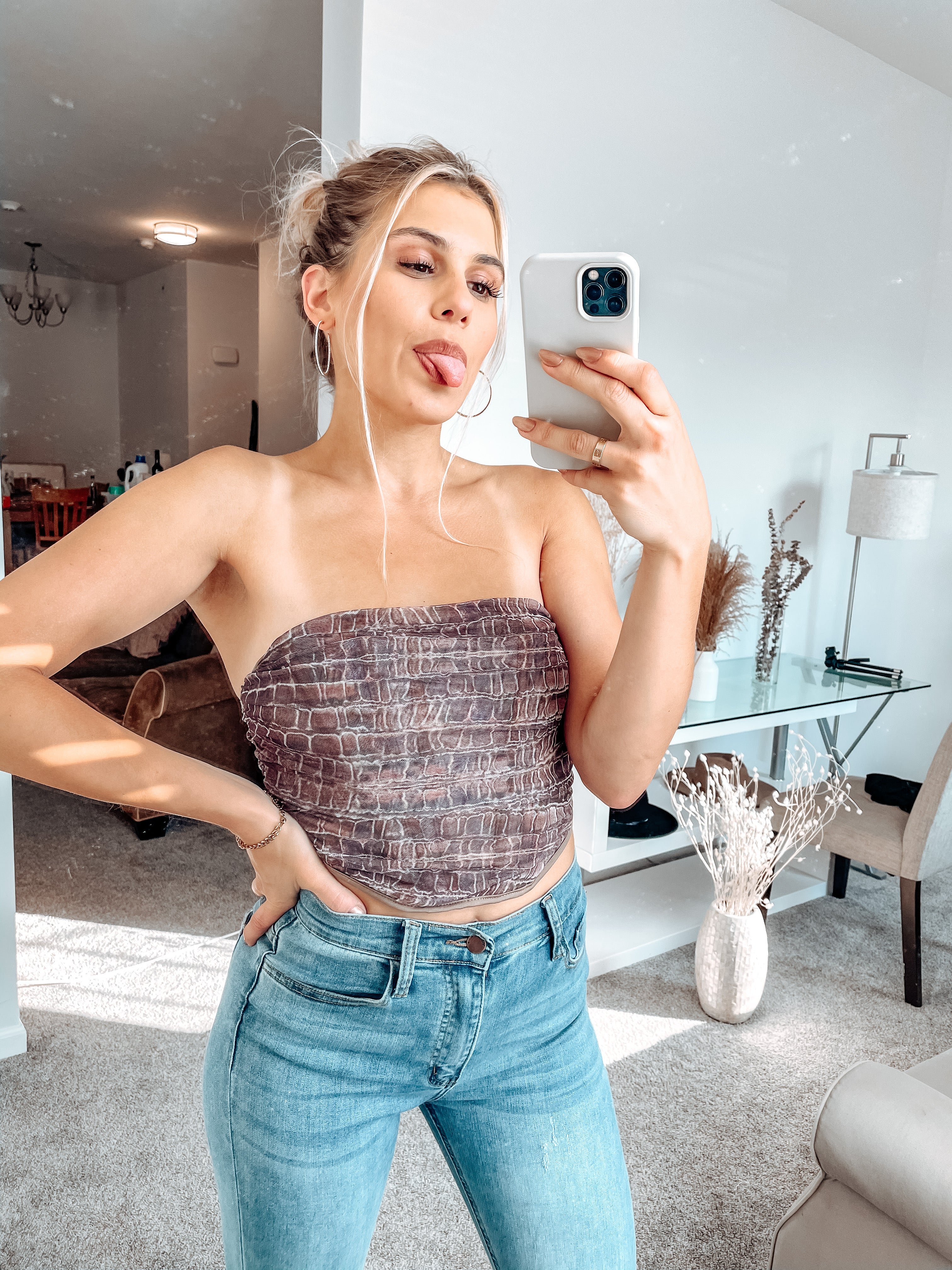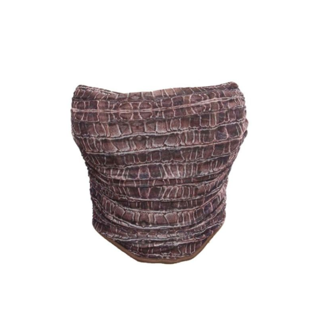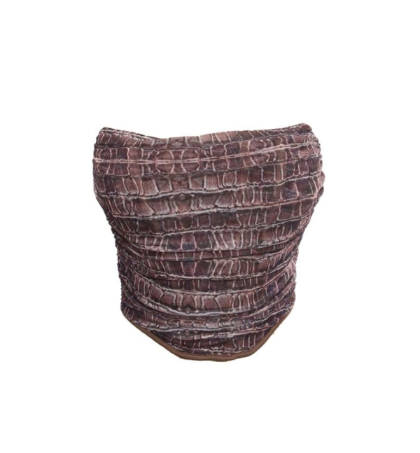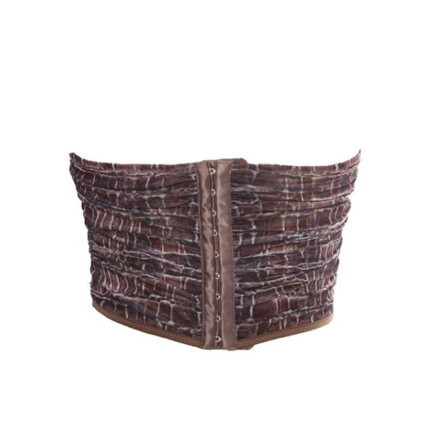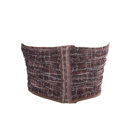 This ruched mesh corset in corc print purple and nude colors is to die for. This corset is super flattering, and has good stretch and support with this design. The back clasps at three different lengths to fit multiple chest sizes.