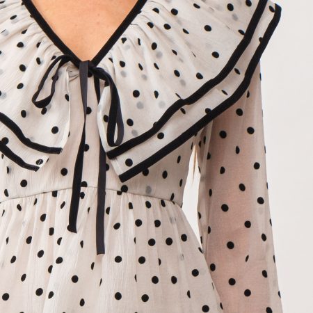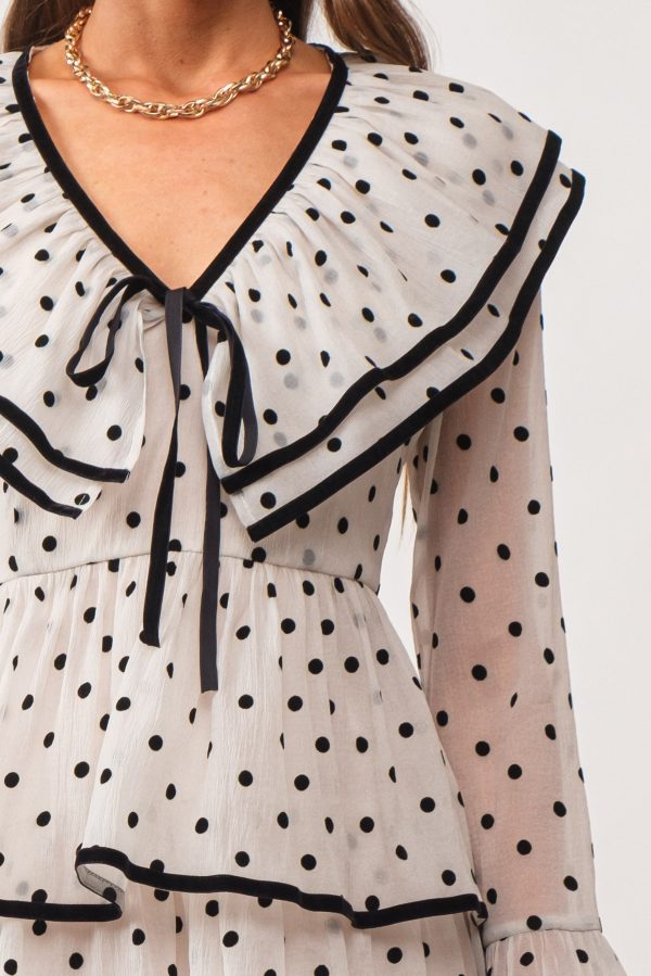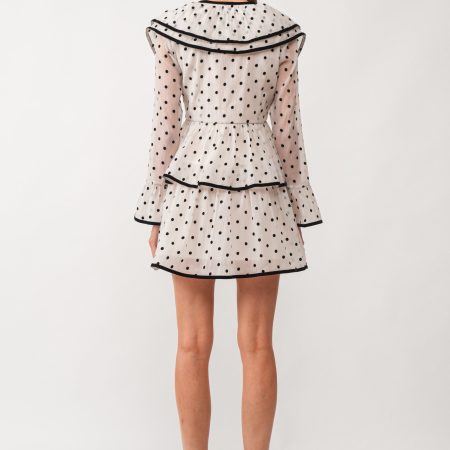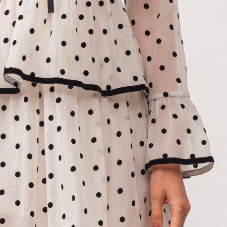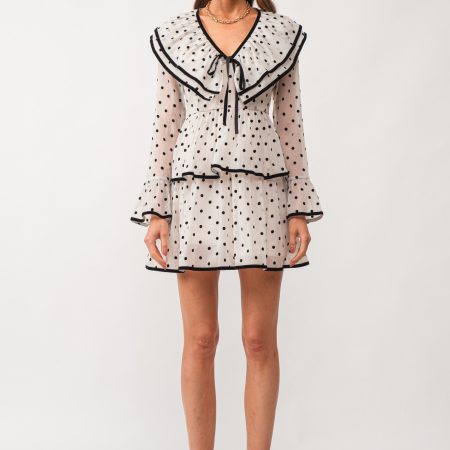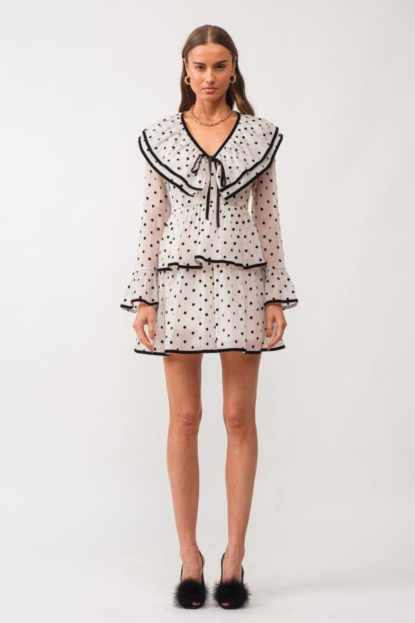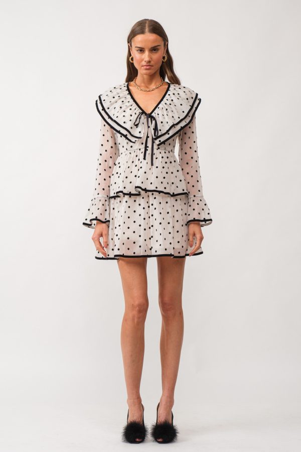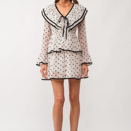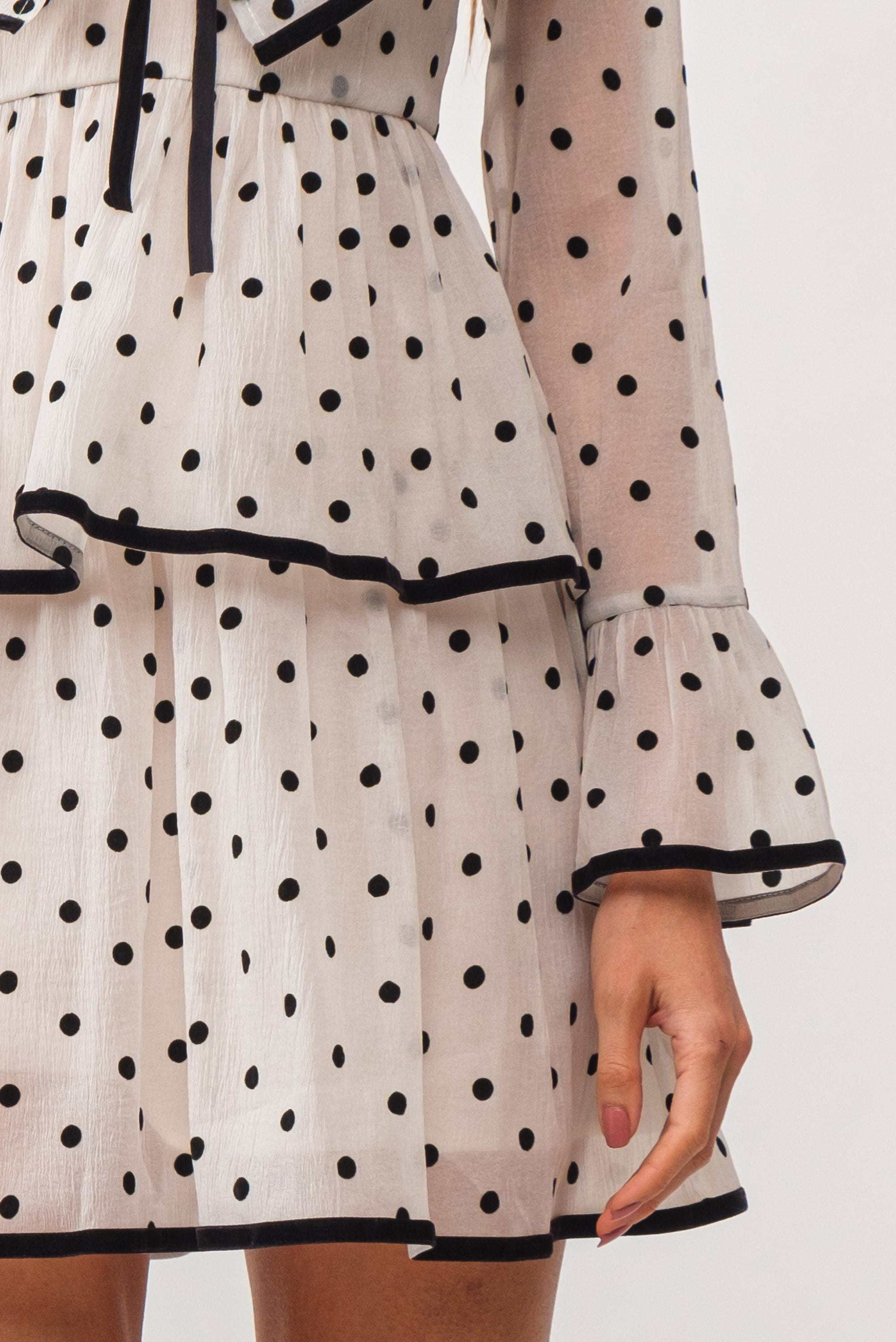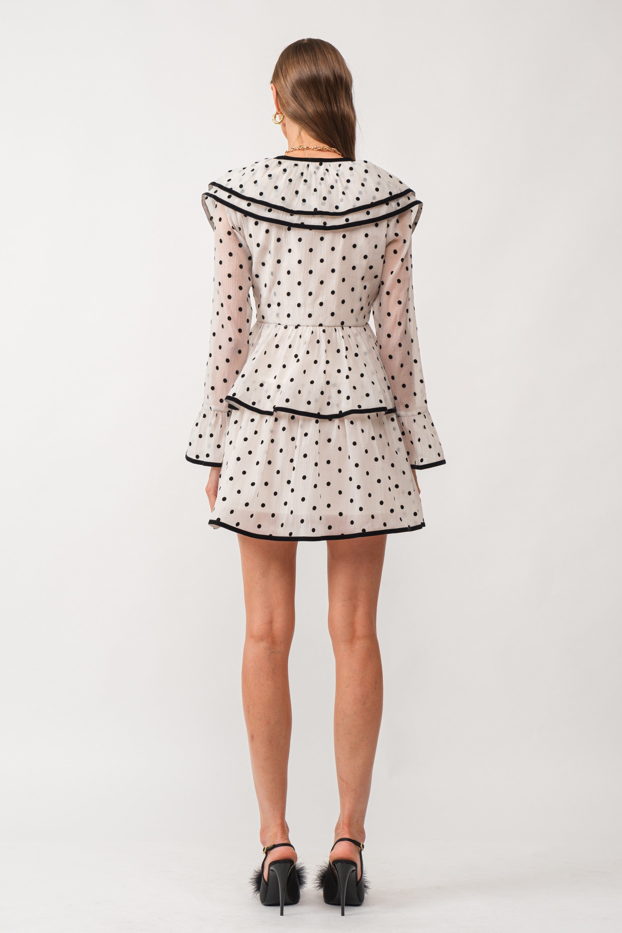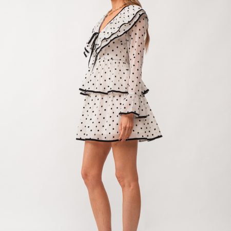 Look stylish and feminine in the Penelope Dress! This mini dress has a white background with black polka dots and beautiful ruffle detailing for a flattering silhouette. Bell sleeves add the perfect finishing touch. Be the best dressed wherever you go!