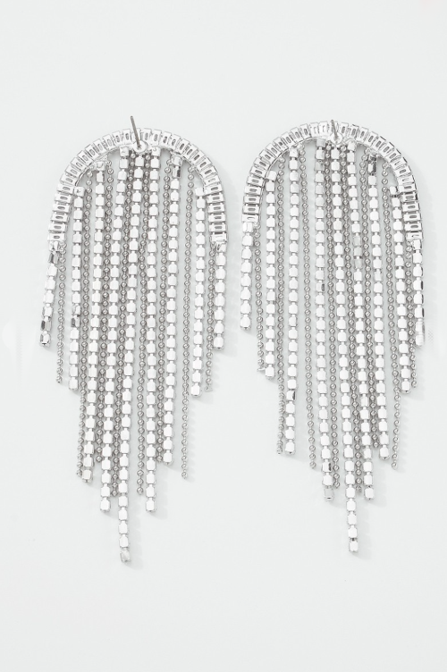 Pick You Up At 7 Earrings are the most stunning earrings we have ever added to the BARE RAGS jewelry collection. These chandelier earrings feature a show stopping rhinestone tassel drop design. These earrings are silver plated and come with a classic push back closing.