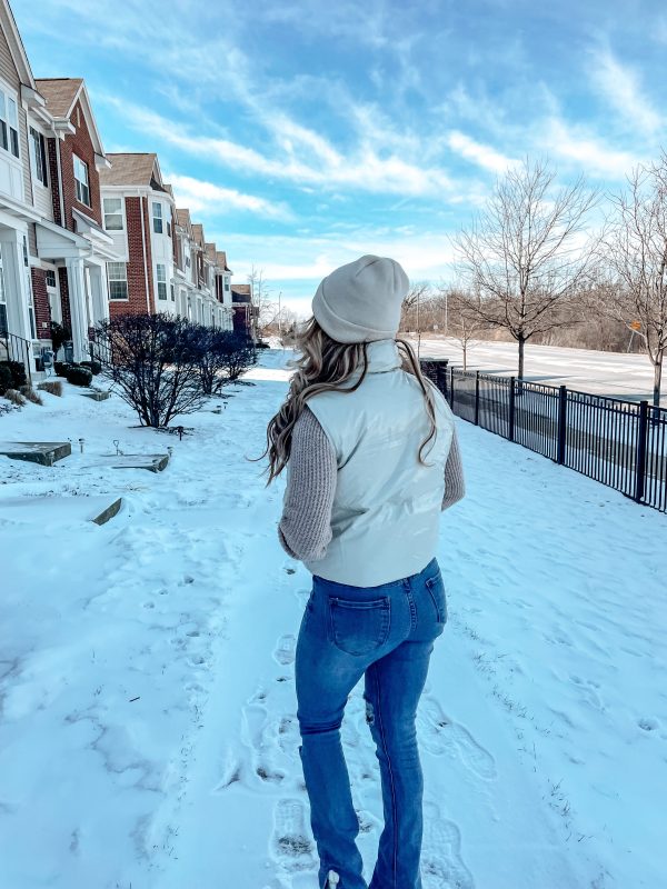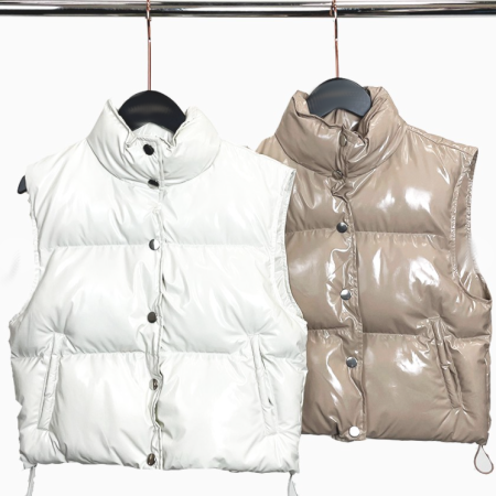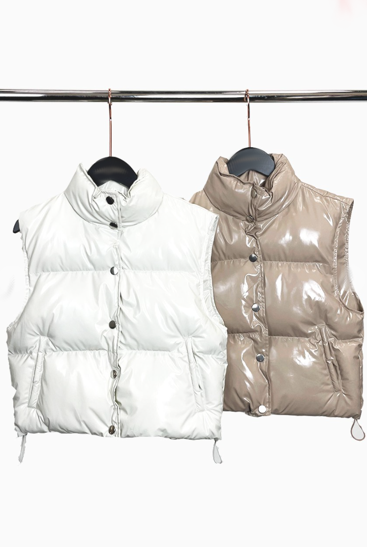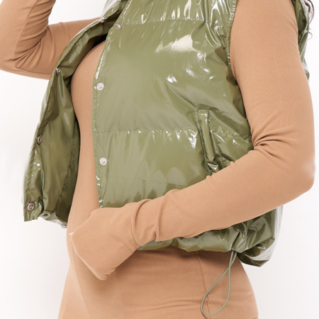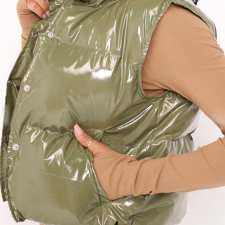 Riley Puffer Vest is a vinyl puffer vest that is so trendy for fall and winter. This puffer fest comes in pearl white, olive green, and light beigecolor. This vinyl finish makes this puffer vest such an awesome statement piece for your closet with its glossy look. This vest comes with a classic front button closure and waist fastening strings.