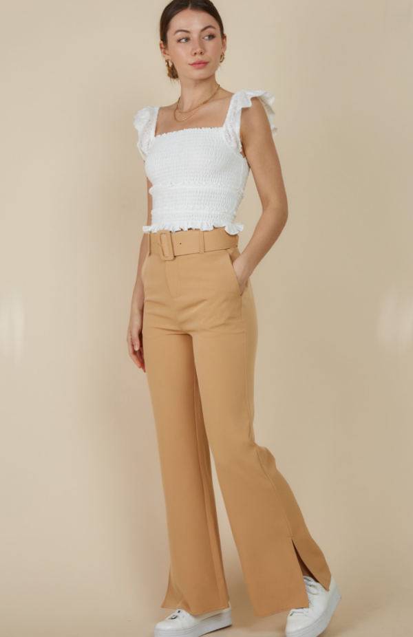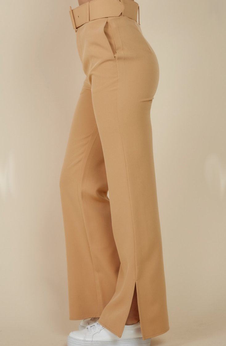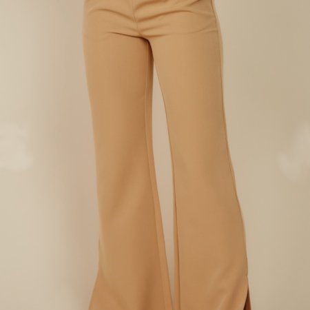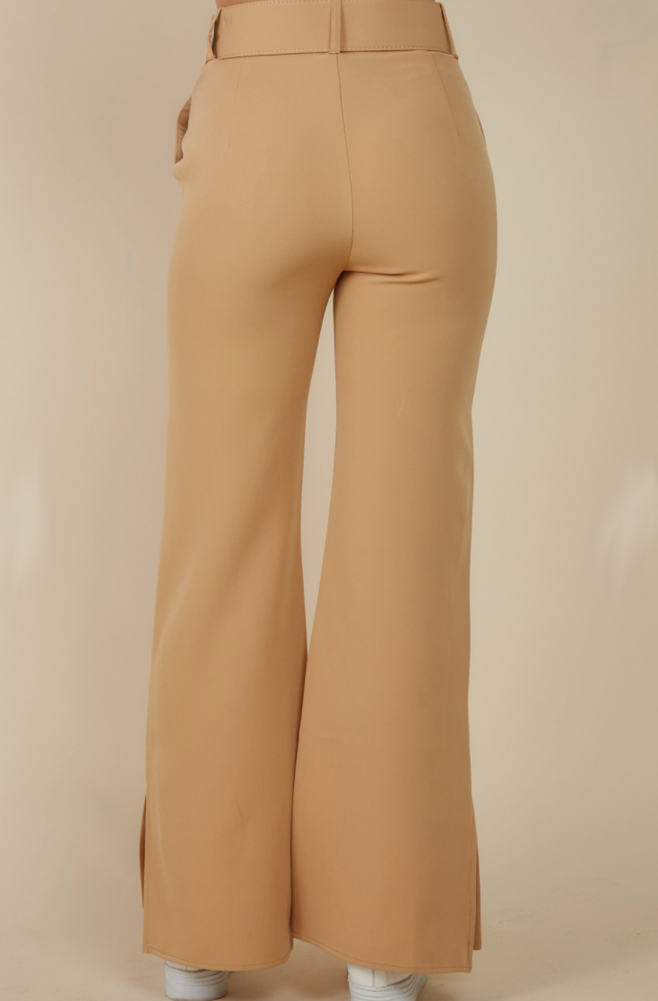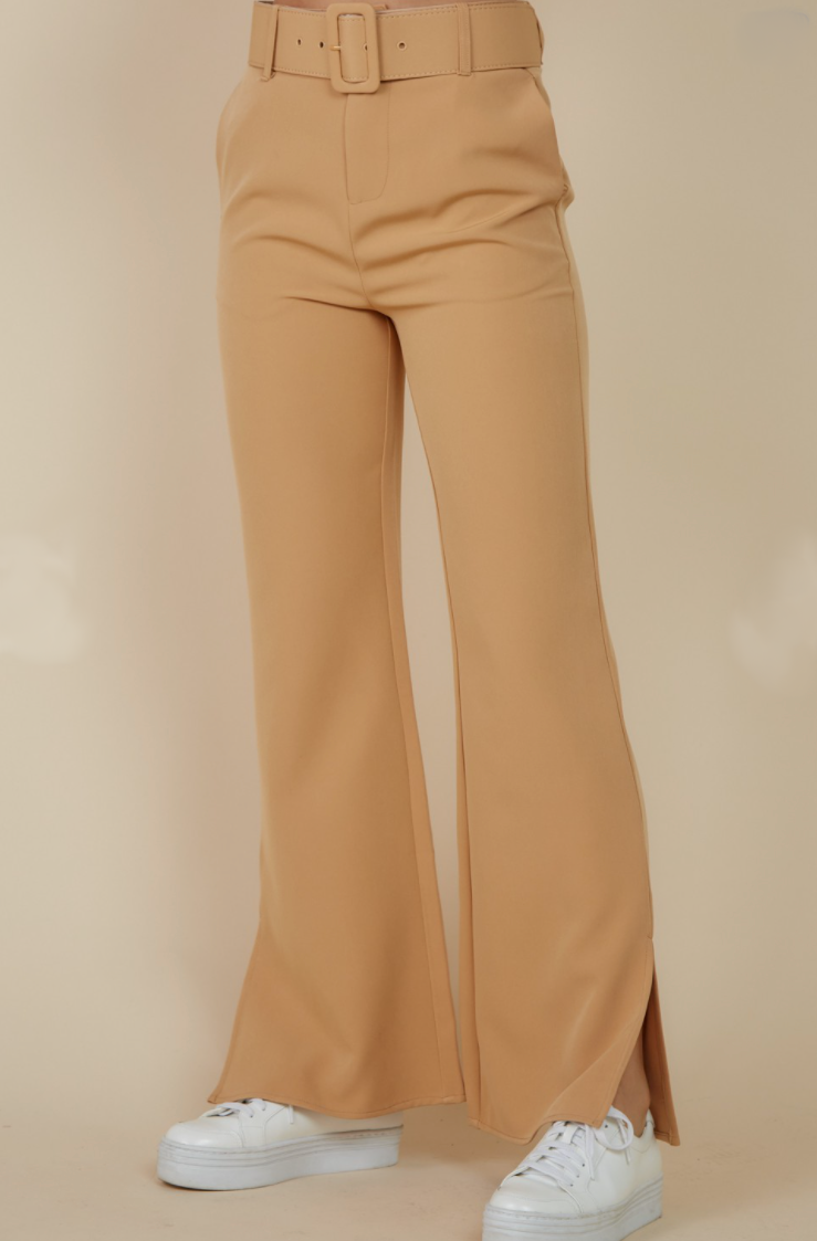 Rachel Wide Leg Pants are perfect for any occasion with this split leg detail at the bottom and cute tan color. These pants are fitted at the top and widen out at the bottom, making them super flattering on any body type. Wear these pants to work or going out with this versatile fit.