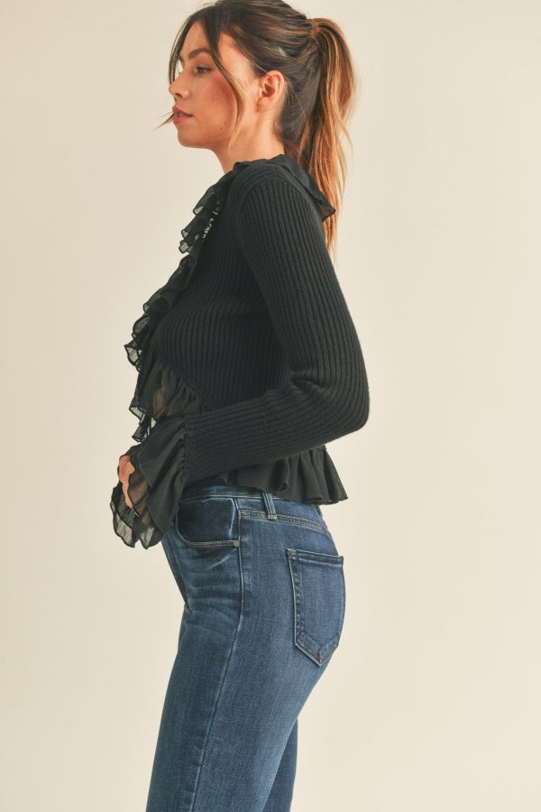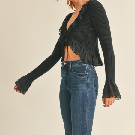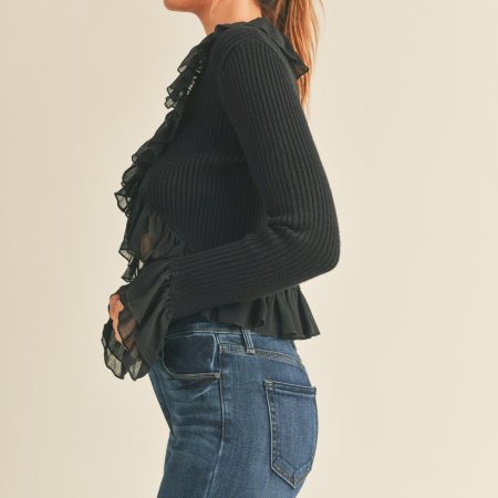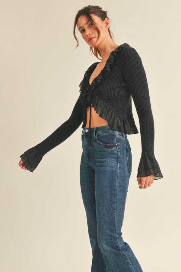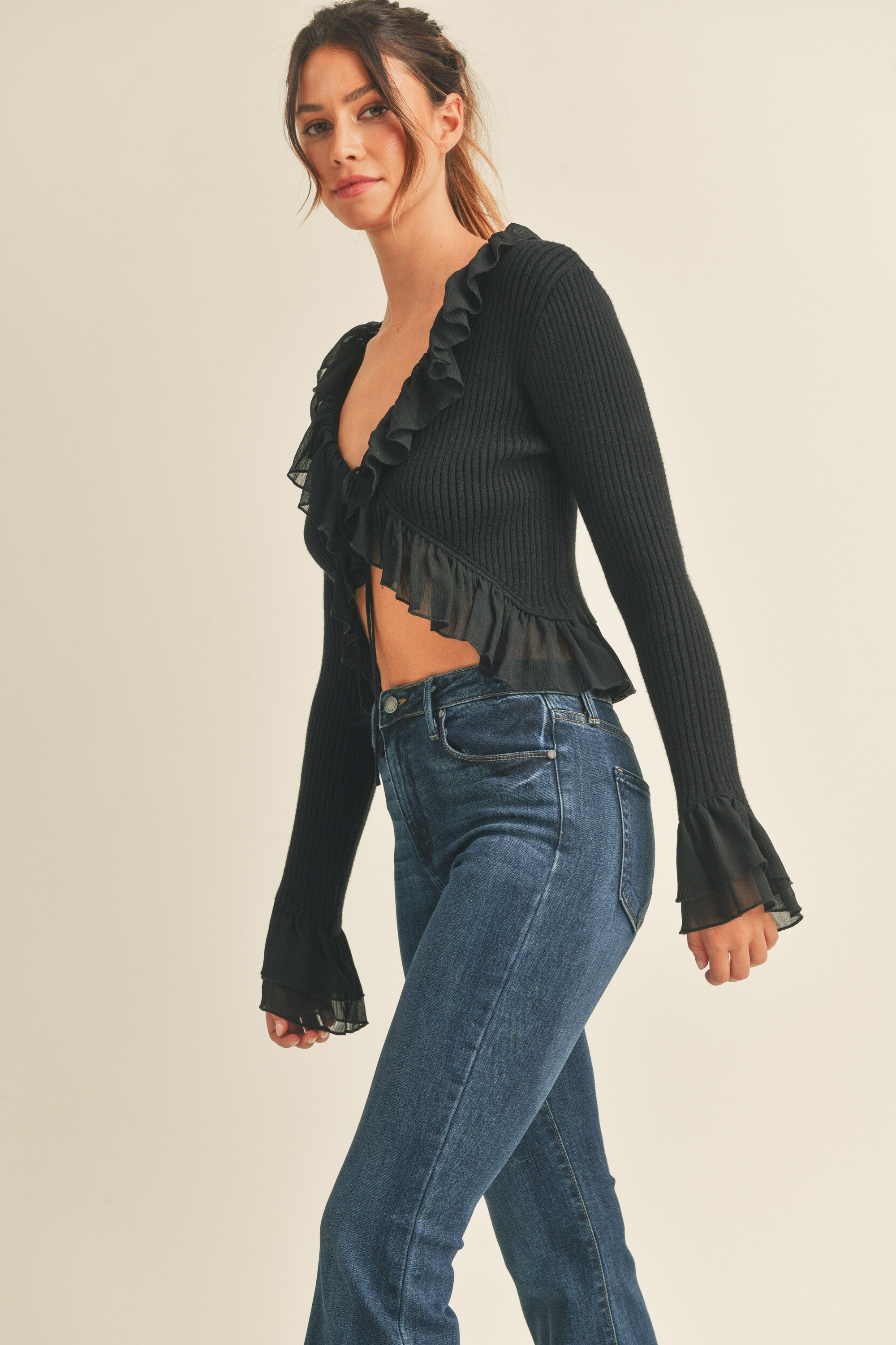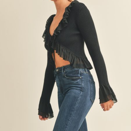 The new Ryder Knit Top is perfect for layering this fall and winter. Made from luxurious ribbed knit, the long sleeve top features an open tie in the front and a woven ruffle trim detailing that adds an elegant and stylish touch. Available in black and cream.