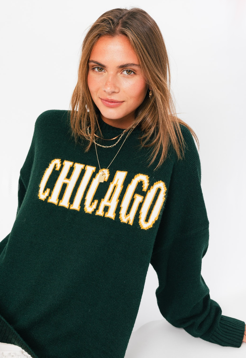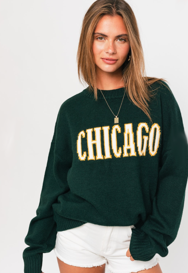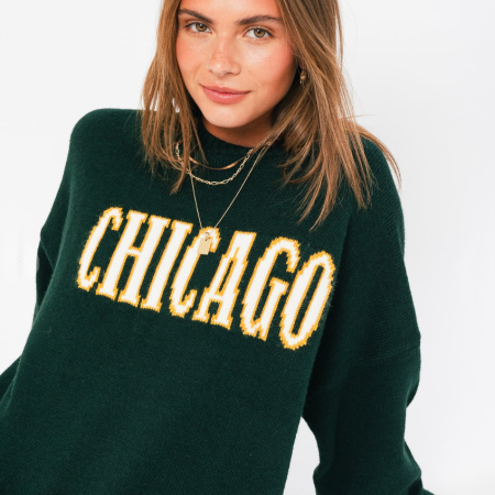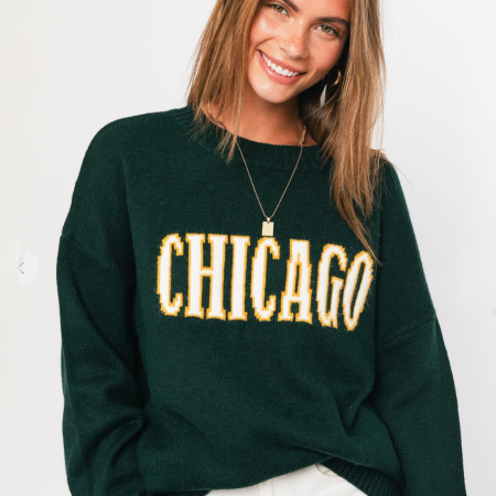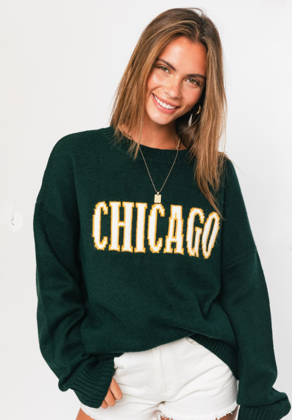 Sweet Home Chicago Sweater is our new long sleeve round neck sweater that has our home’s name on it “Chicago.” This sweater comes in dark hunter green and the letters Chicago come in white with a yellow border around it. This sweater is slightly oversized and can be styled up or down. BARE RAGS headquarters and home is Chicago, so we decided to get a limited edition sweater to show our love for this city.
