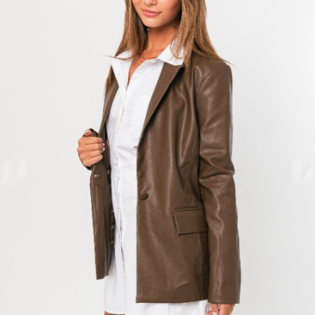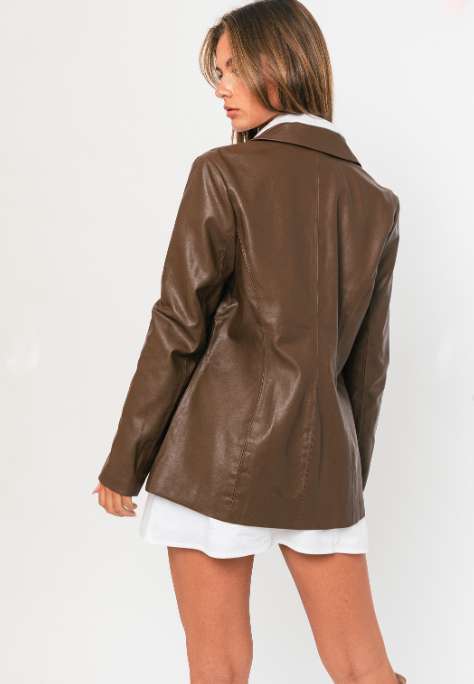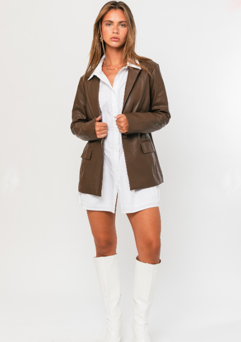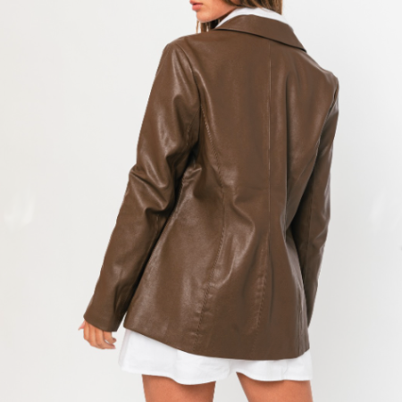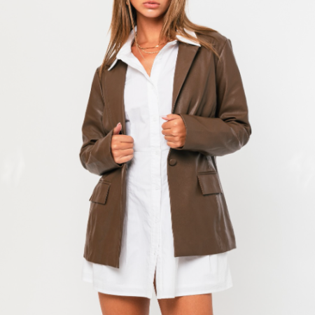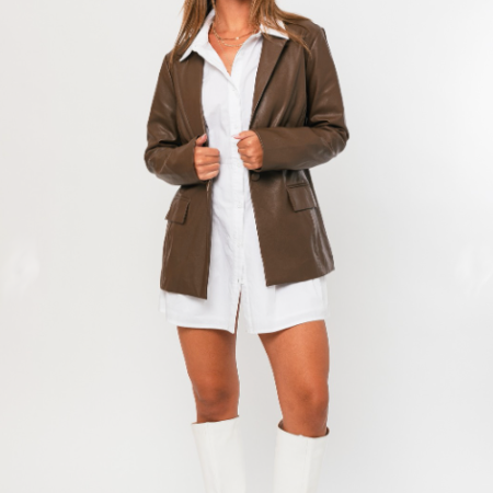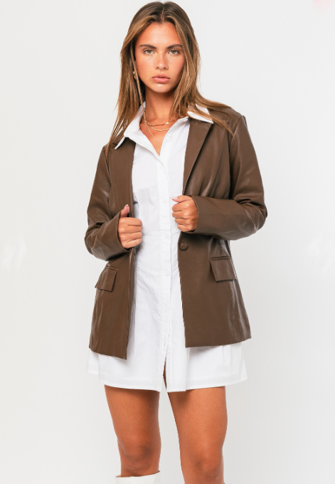 This chocolate brown color leather blazer comes in multiple colors and is super lightweight. Comes in colors camel, brown, and cream, and can be worn for work or brunch with the girls. Weekends In France Leather Jacket is so chic and can be paired with your favorite work pants or denim jeans.