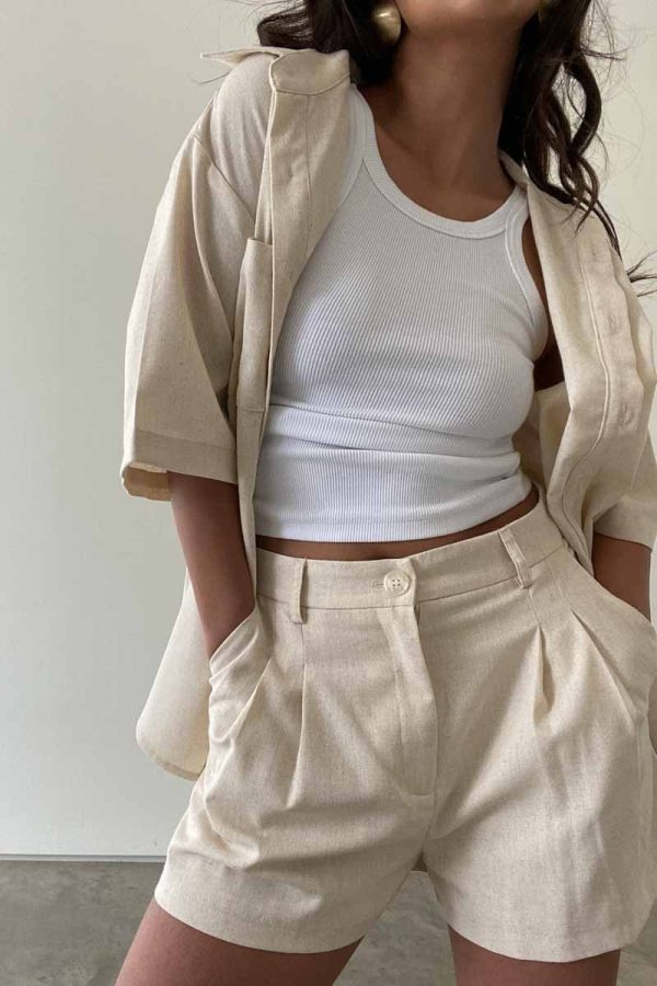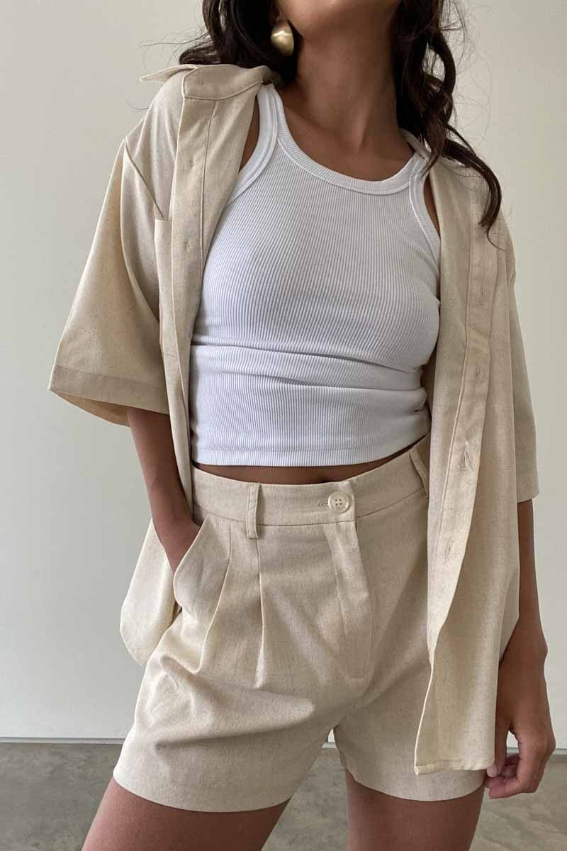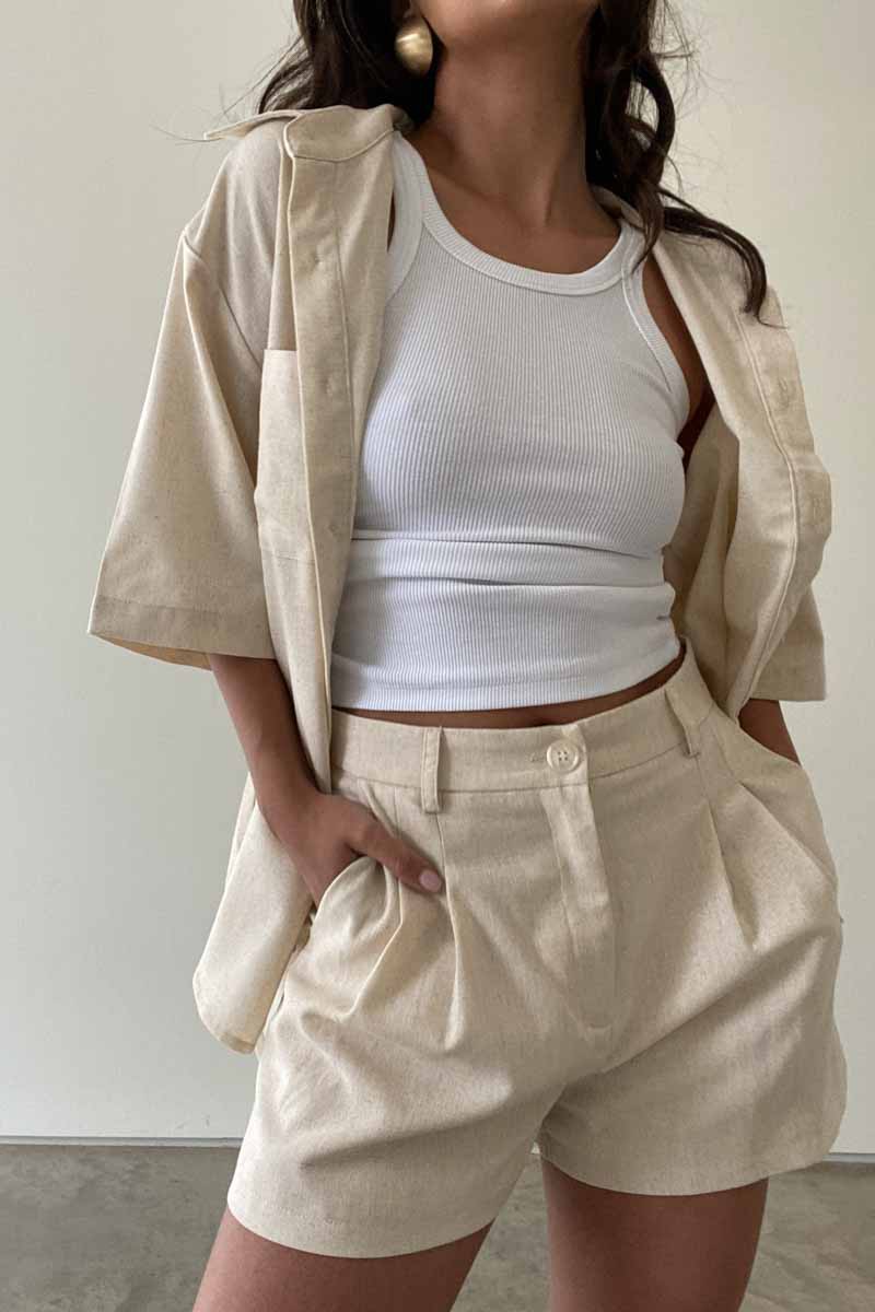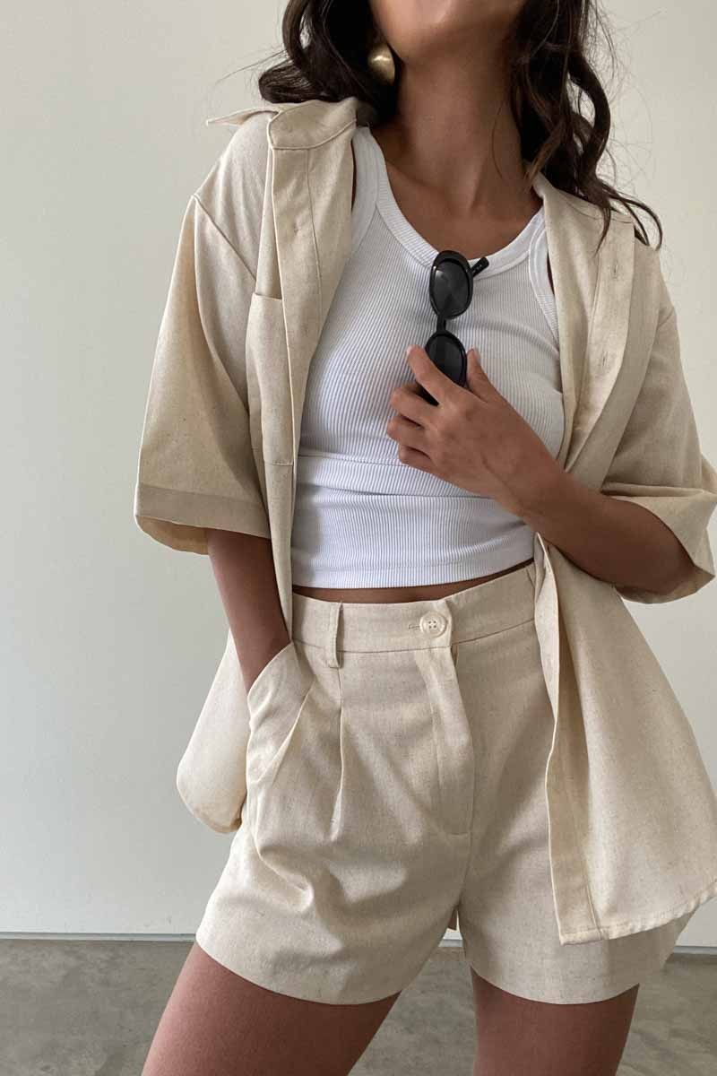 This West Coast Linen Set is perfect for any warm-weather event. With this creamy beige color is a timeless classic that will never goes out of style. The set includes linen shorts and a linen short-sleeved button-up, perfectfor an easy summeroutfit for any occasion.Dress this linen set up with some heels or down with some sneakers.