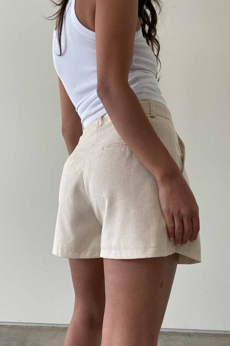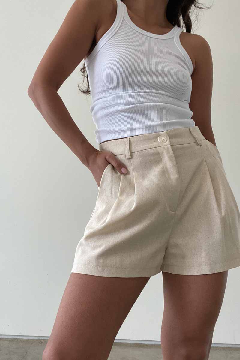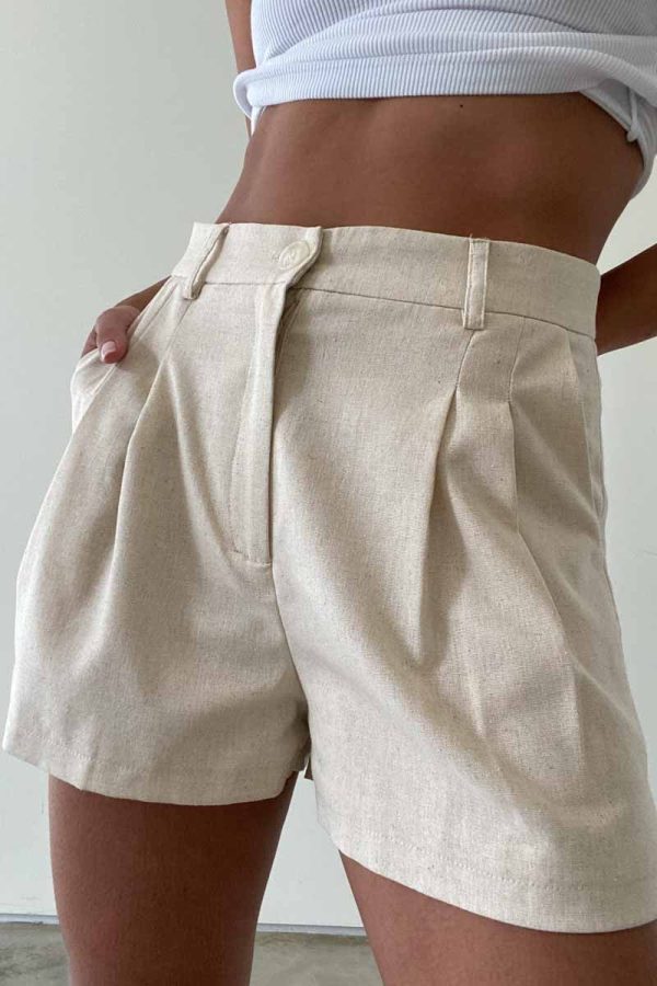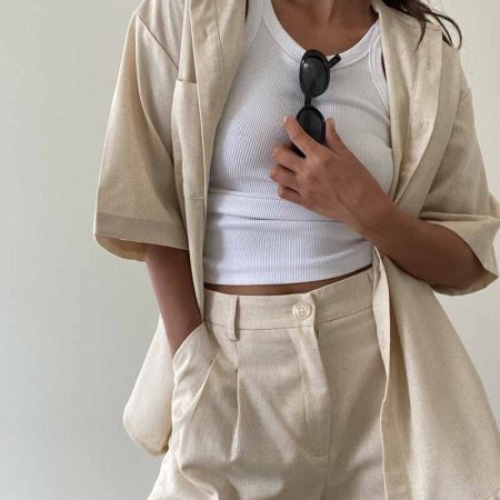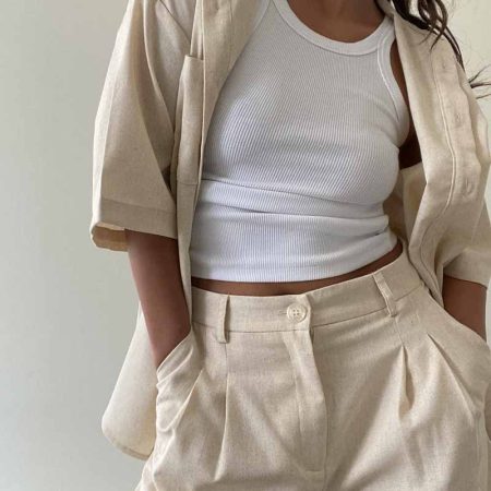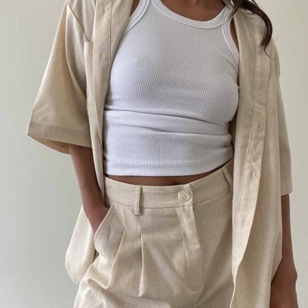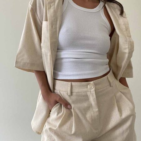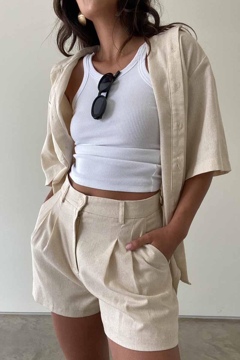 This West Coast Linen Set is perfect for any warm-weather event. With this creamy beige color is a timeless classic that will never goes out of style. The set includes linen shorts and a linen short-sleeved button-up, perfectfor an easy summeroutfit for any occasion.Dress this linen set up with some heels or down with some sneakers.