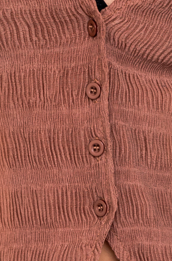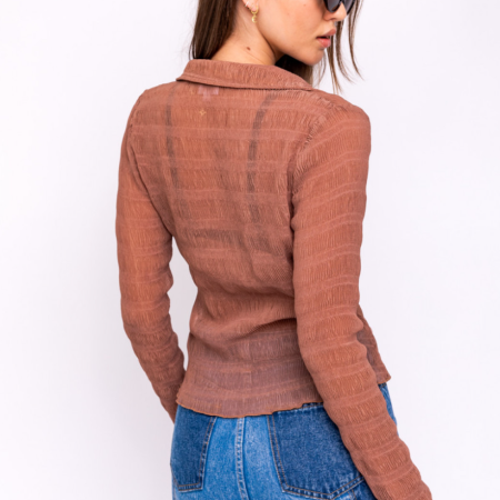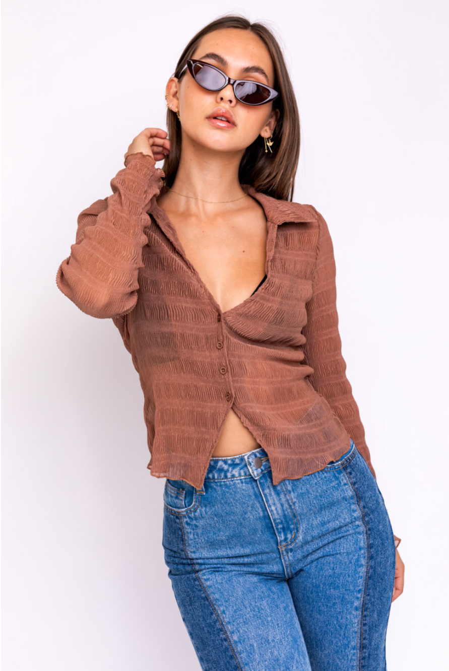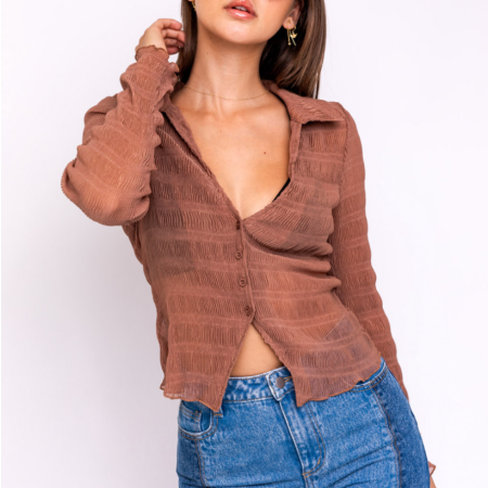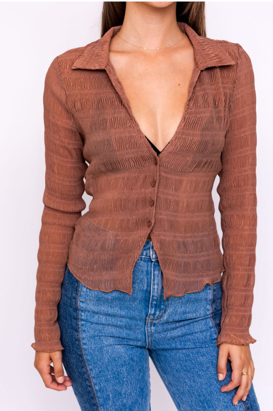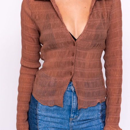 Westloop Button Up is a textured mid length button up with a trendy collared design. Comes in this stunning reddish brown color and clasps only in the middle of the shirt, making this top so cute and easy to pair with your fave denim jeans or work pants. West Loop Button Up is slightly see through, and can be worn with a bold colored bralette or nude colored bodysuit.