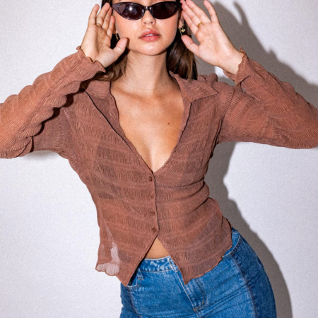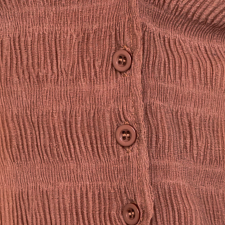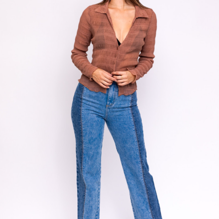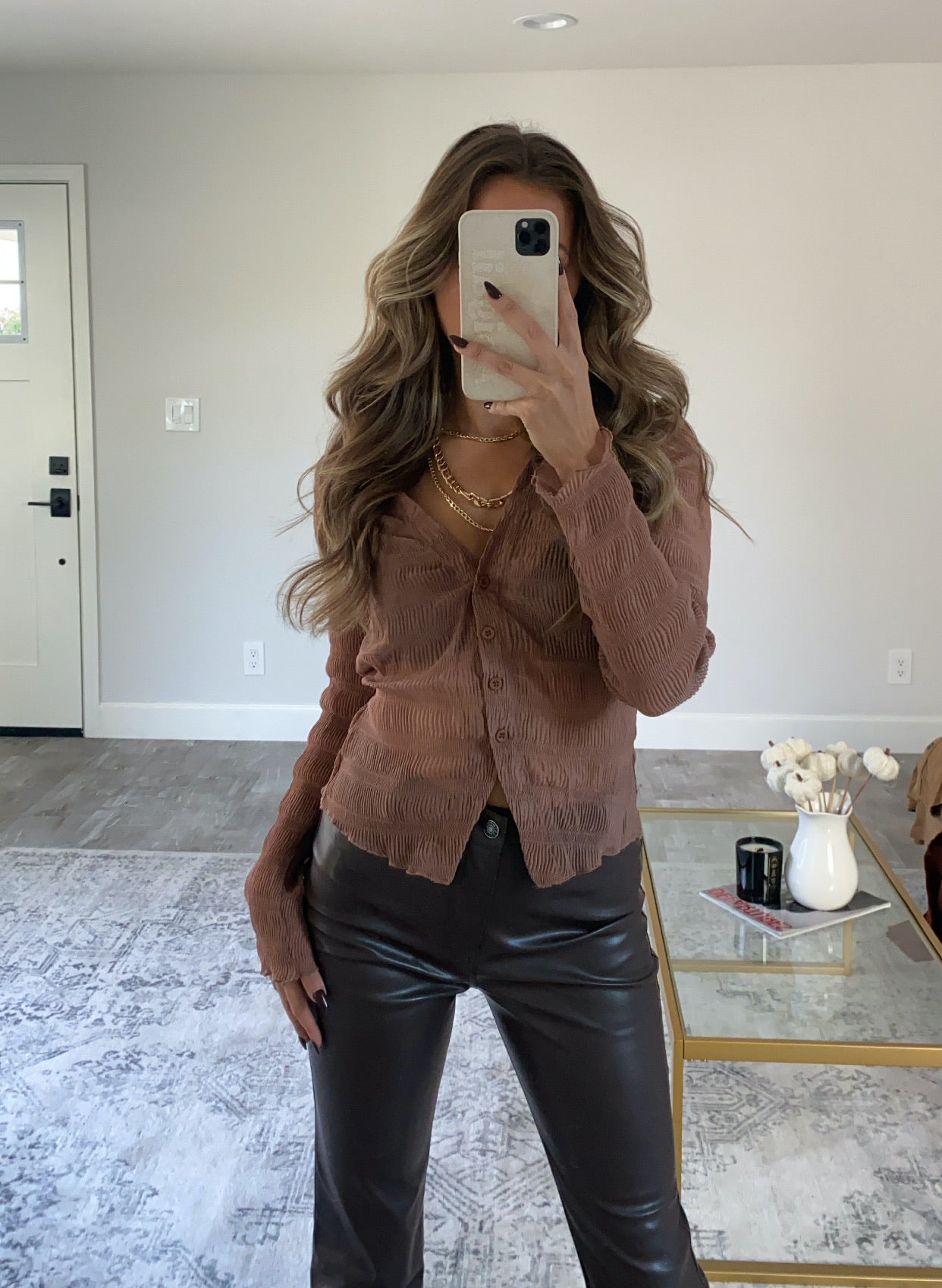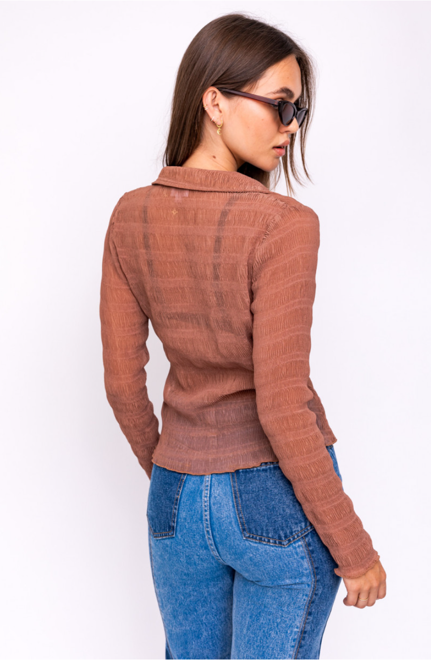 Westloop Button Up is a textured mid length button up with a trendy collared design. Comes in this stunning reddish brown color and clasps only in the middle of the shirt, making this top so cute and easy to pair with your fave denim jeans or work pants. West Loop Button Up is slightly see through, and can be worn with a bold colored bralette or nude colored bodysuit.