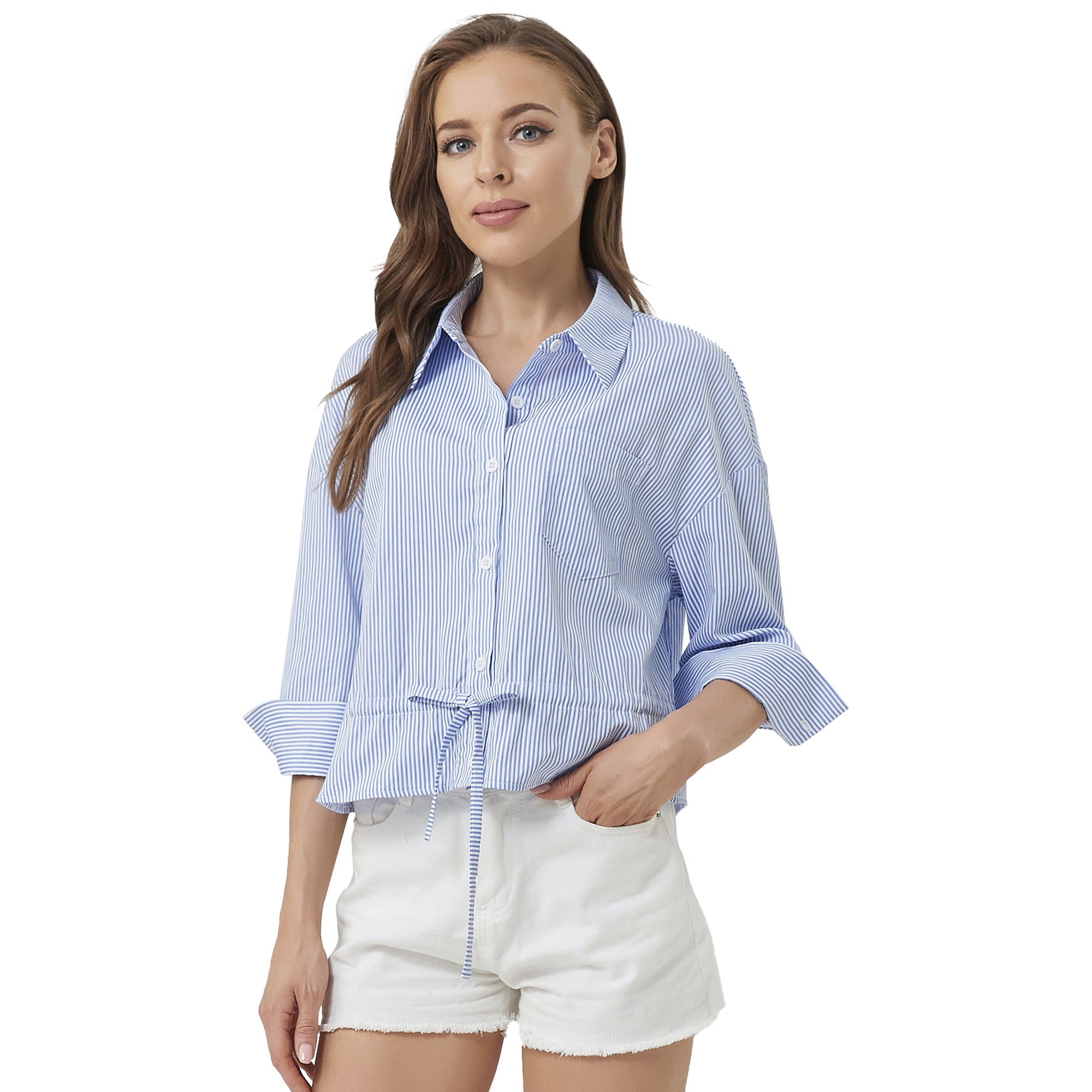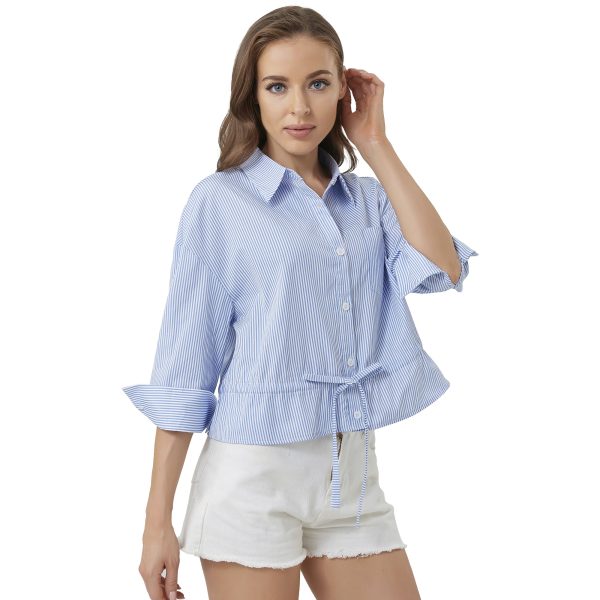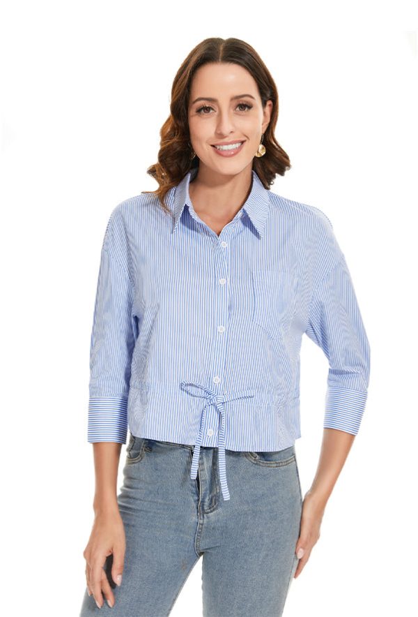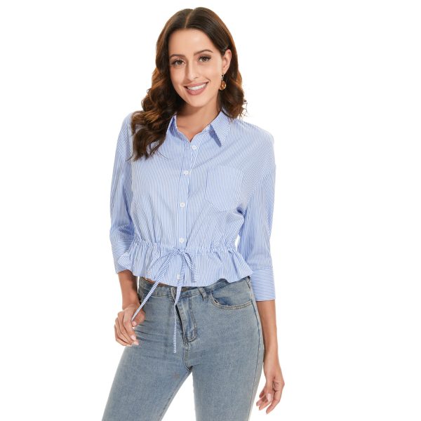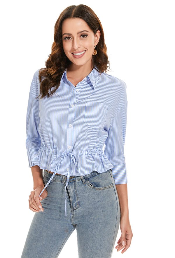 Women’s Striped 3/4 Sleeve Button Down Shirts with Drawstring Waist in Blue