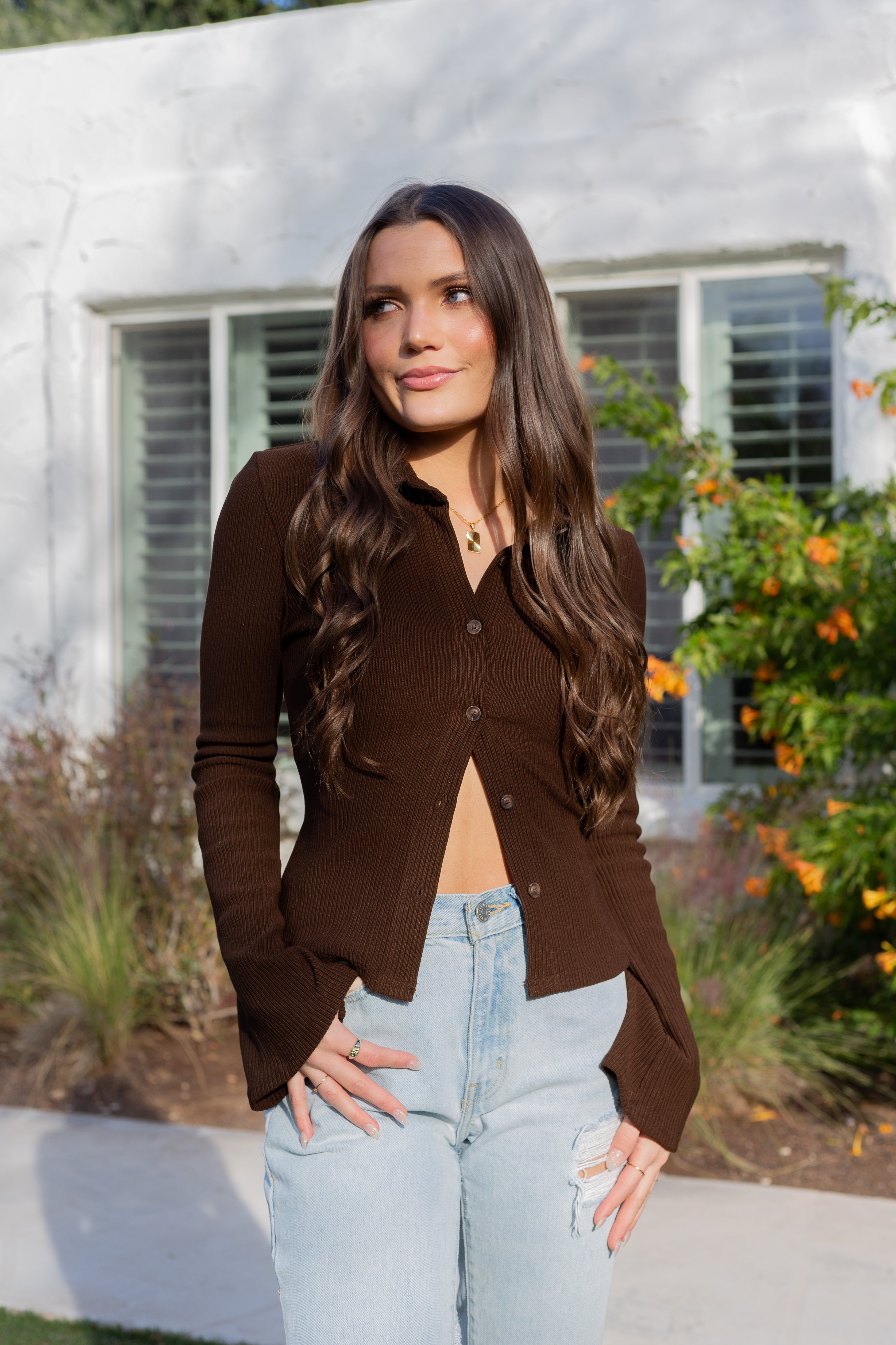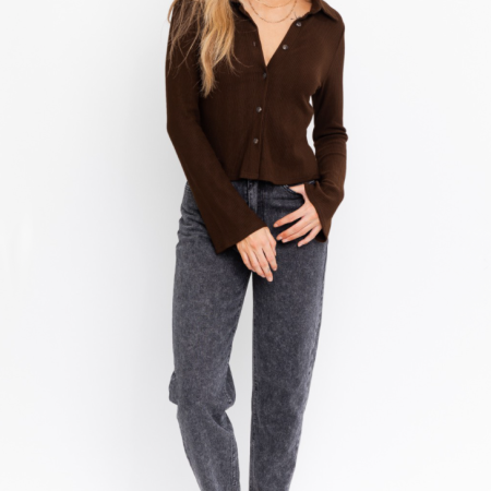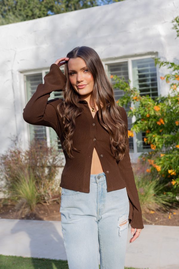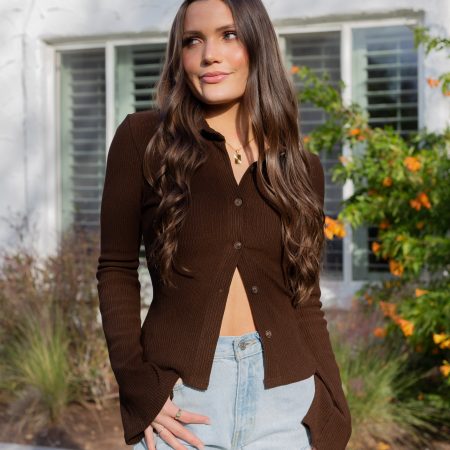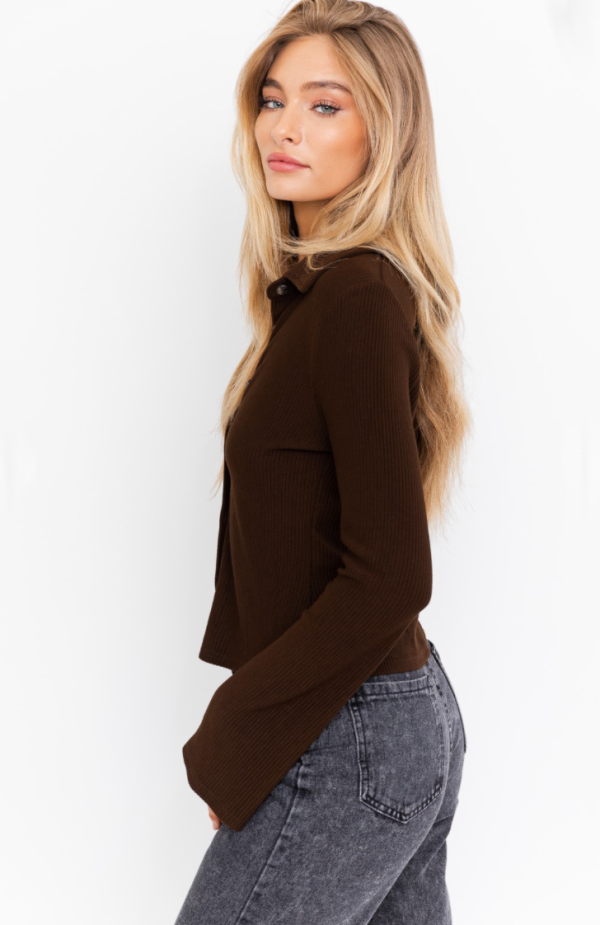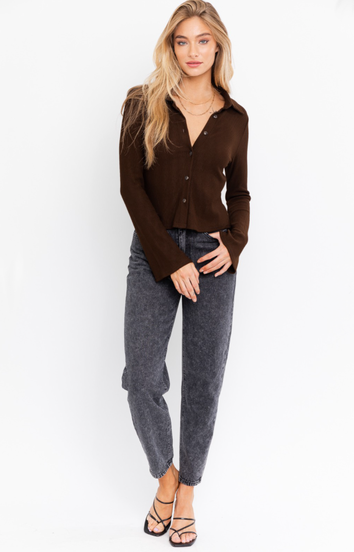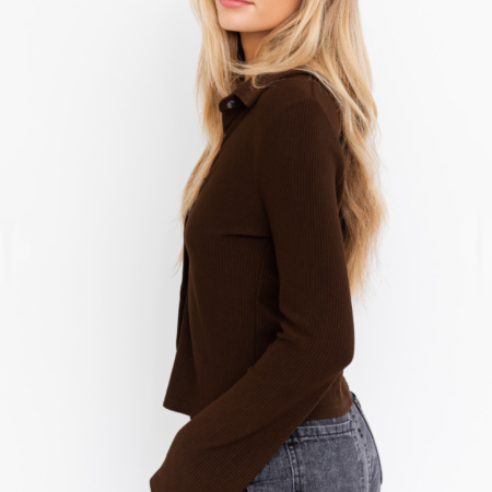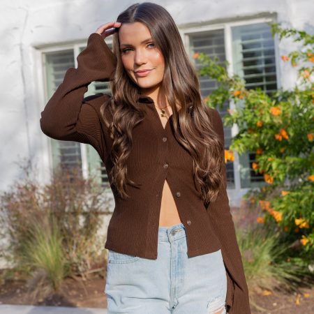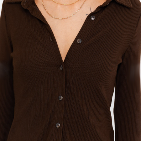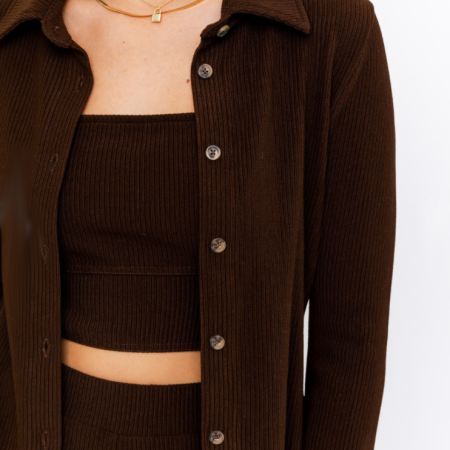 Wren Button Up is the sexy and sophisticated button up that can be easily paired over your favorite cami or bralette. This midi length brown button up comes with a ribbed textured design and collared top. Wren Button Up is long sleeved and flares a little bit at the bottom of the sleeves.
