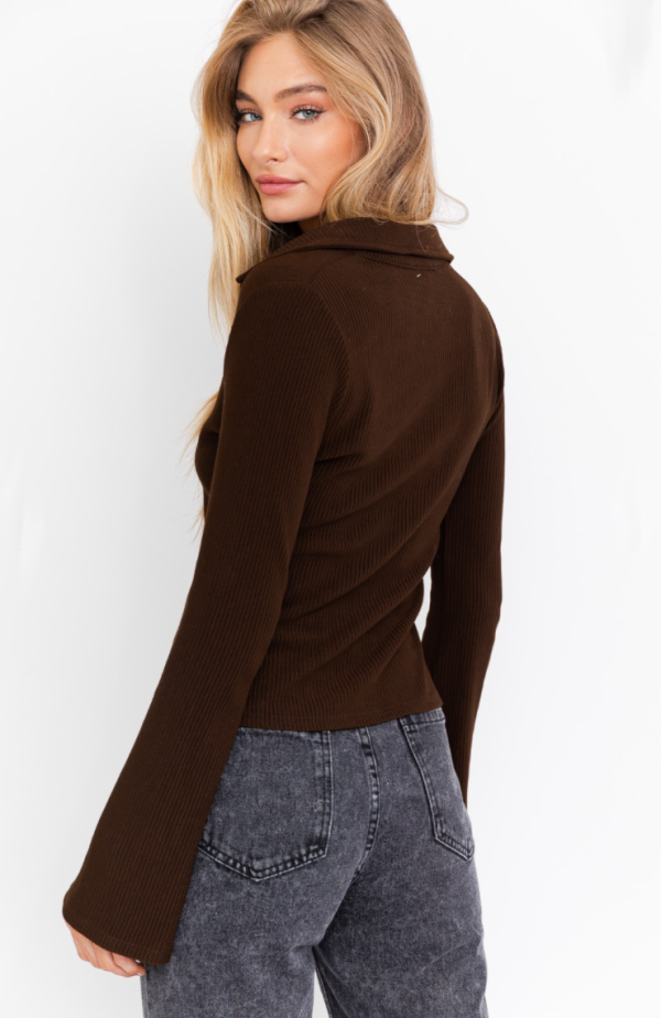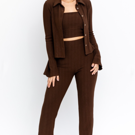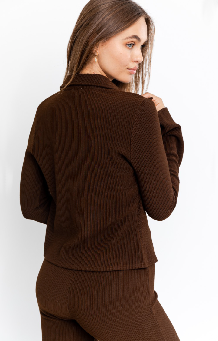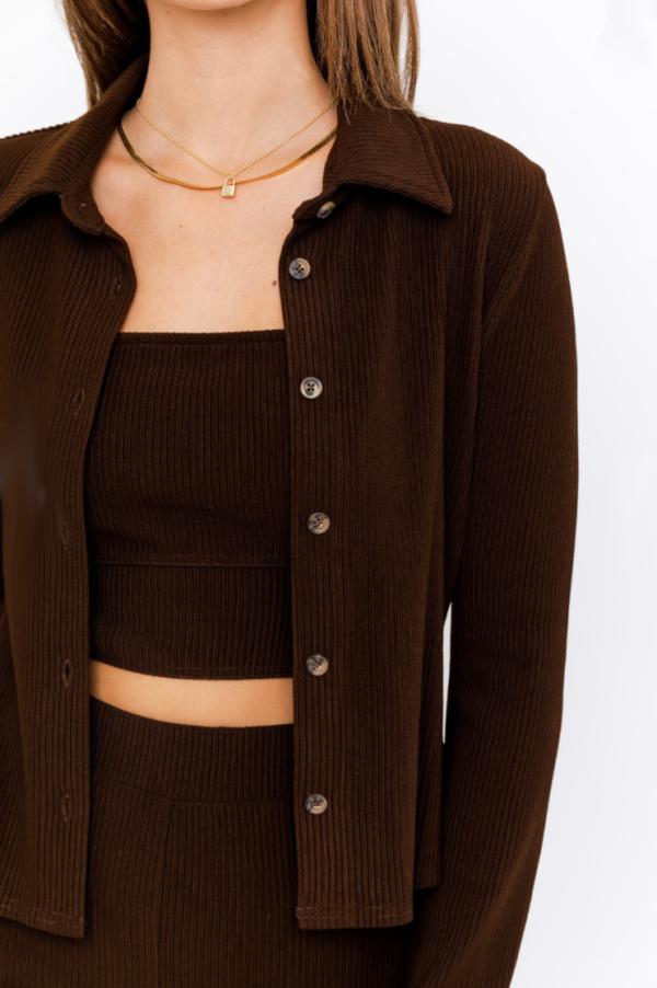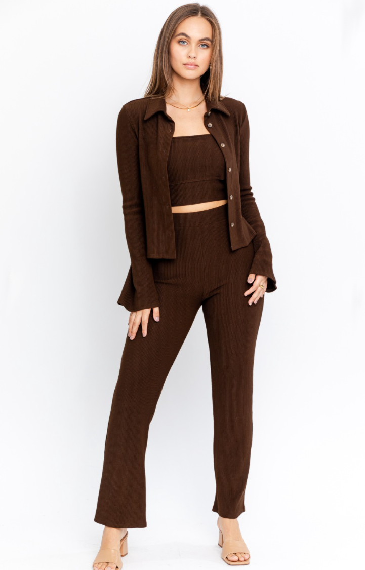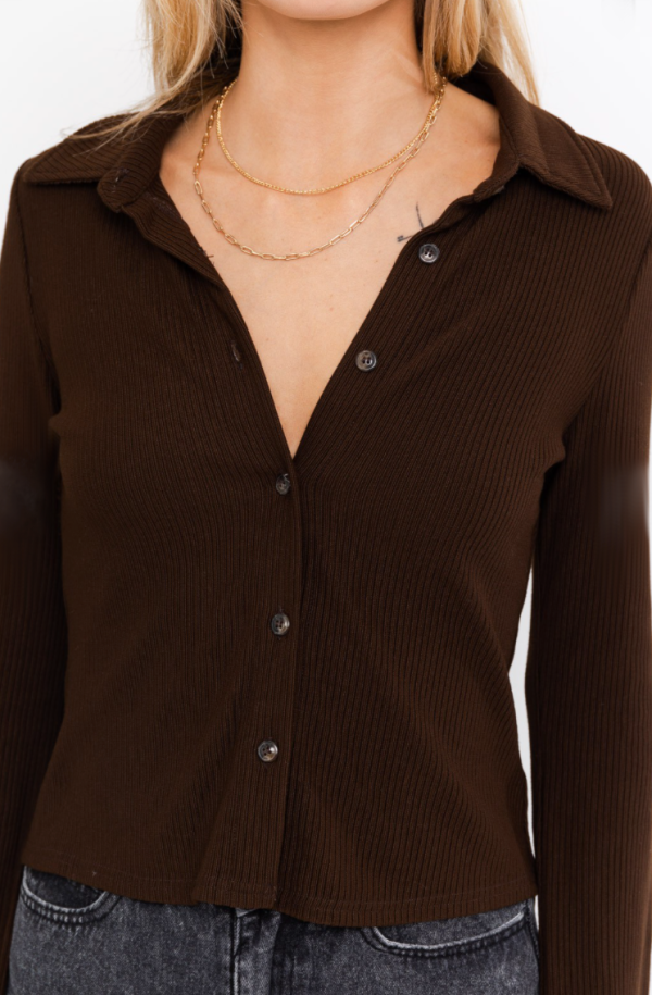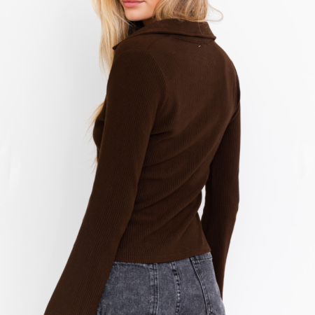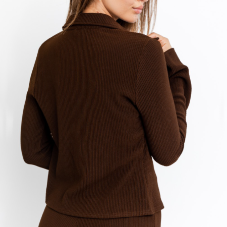 Wren Button Up is the sexy and sophisticated button up that can be easily paired over your favorite cami or bralette. This midi length brown button up comes with a ribbed textured design and collared top. Wren Button Up is long sleeved and flares a little bit at the bottom of the sleeves.